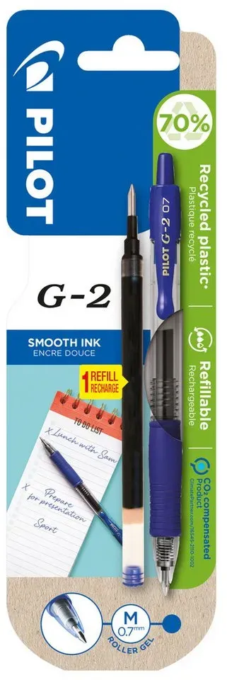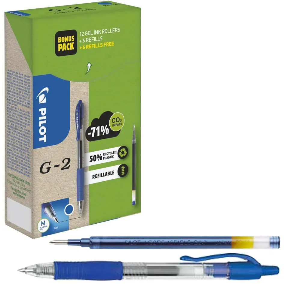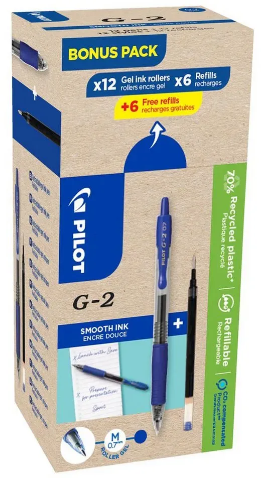 Der angezeigte Preis könnte seit dem letzten Update gestiegen sein - EAN: 3131910556183 - 12er-Pack Gelschreiber »G2-07« inkl. 12 Ersatzminen, Kugel-Durchmesser: 0.7 mm, Strichbreiten-Kategorie: M, Strichstärke: 0,4 mm, Ausführung der Vorschubmechanik: Druckmechanik, Material des Clips: Kunststoff, Ausführung der Griffzone: gummiert,... - Zustand: NEW - bei OTTO Office - gefunden von Buycentral Dieses umweltfreundliche Set enthält 12 Gelschreiber und 12 Minen, wobei die Stifte zu 70% aus Recycling-Kunststoff bestehen. ![]() Gelschreiber PILOT G2-7, blau, Strichbreite 0,4 mm, dokumentenecht, nachfüllbar, 70 % Recycling-Kunststoff, 12 Stück + 12 Minen blau
