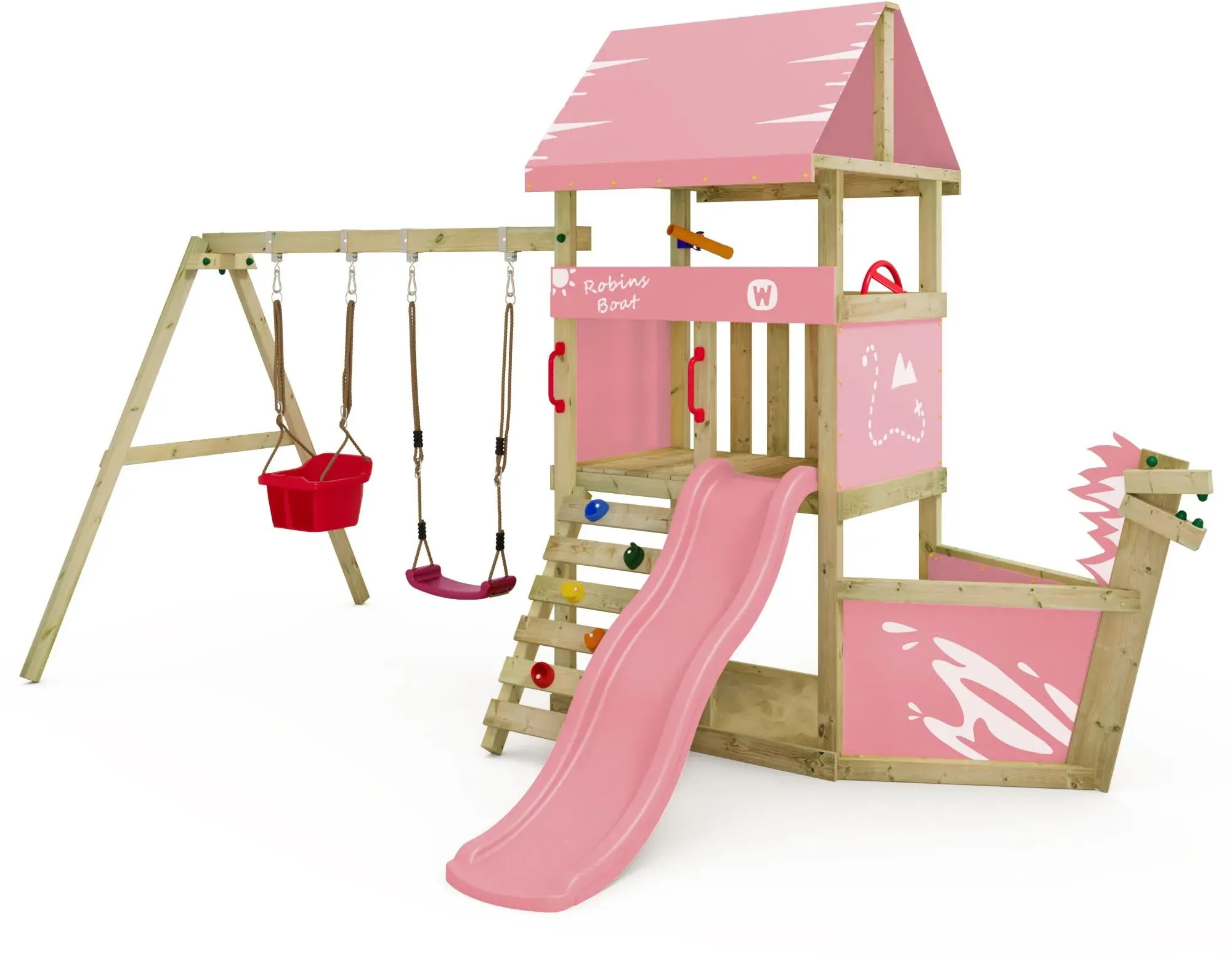 ![]() ![]() Wickey Spielturm DinkyHouse Piratenschiff - pastellpinke Rutsche & Plane - Kinder Kletterturm für den Garten aus Massivholz - 372x317x247 cm
