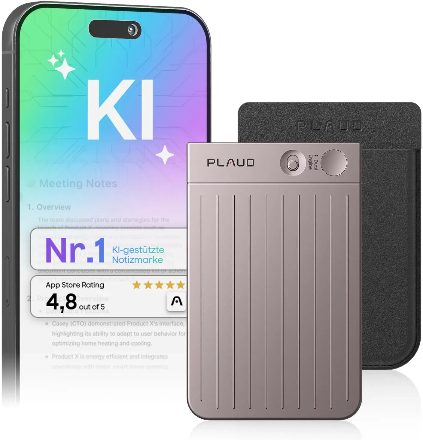 Kategorie: Diktiergeräte - plaud - Das Plaud Note KI Diktiergerät: Plaud APP integriert erweiterte Transkriptionsfunktionen und ermöglicht eine schnelle und genaue Transkription in 112 Sprachen. Entwickelt auf GPT-5, Claude 4.0, Gemini 2.5 Pro und o3-mini, können Benutzer Zusammenfassungen, Besprechungsprotokolle und Aufgabenlisten erstellen und so die tägliche Produktivität steigern Mit dem Dual-Mode-Präzisionsaufnahmesystem: Plaud Note ist das weltweit erste Aufnahmegerät, das mit zwei Aufzeichnungsmodulen ausgestattet ist. Durch einfaches Drücken der One-Touch-Aufnahmetaste nach oben, um den fortschrittlichen Vibration Conduction Sensor (VCS) zu aktivieren, der für klare Gesprächsaufnahmen sorgt, indem er den internen Klang des Telefons erfasst. Dieser Diktiergerät Mini eignet sich perfekt für Besprechungen, Anrufe, Sprachnotizen und Präsentationen Ihre Privatsphäre steht an erster Stelle: Lokale Daten werden verschlüsselt, Cloud-Dateien sind exklusiv für Sie zugänglich, Die Datenverarbeitung erfolgt nur mit Ihrer Genehmigung. Die Apps und Webportale von Plaud bieten unbegrenzte Cloud-Speicher. Verwalten Sie Audiodateien mühelos, sortieren Sie sie und teilen Sie Aufnahmen, Transkriptionen und Zusammenfassungen ganz einfach. Verbessern Sie die Zusammenarbeit im Team mit Transkriptions- und Zusammenfassungsfunktionen Hervorragende Aufnahmequalität: Dieser Mini Aufnahmegerät verfügt über zwei integrierte Mikrofone und Sprachverbesserung durch KI, um Ihnen einen klaren ... ![]() ![]() Plaud Note KI Digitales Diktiergerät mit Hülle - 64 GB Aufnahmegerät mit KI-Technologie zum Transkribieren und Zusammenfassen, One-Touch-Aufnahme, Rauschunterdrückung, Unterstützt 112 Sprachen