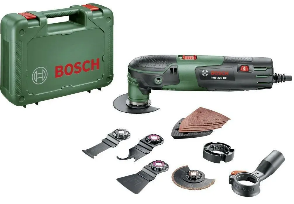 Kategorie: Multifunktionswerkzeuge - Bosch - GTIN:3165140828482 - Multifunktionswerkzeug PMF 220 CE von BoschVielseitige Lösung für verschiedenste DIY-ArbeitenLeistungsstarker 220-Watt-Motor mit elektronischer DrehzahlvorwahlBosch MagnetHold-System unterstützt beim ZubehörwechselEs ist umfangreiches Starlock-Zubehör für vielfältige Anwendungen erhältlichTiefenanschlag für präzises SegmentsägenSchneiden, Sägen, Schleifen, Schaben, Fräsen, Raspeln und Polieren verschiedenster MaterialienBIM Segmentsägeblatt Wood and Metal, 85 mm.Lieferumfang:ACZ 85 EB (2 609 256 943)Deltaschleifplatte 93 mm AVZ 93 G (2 609 256 956)Deltaschleifblatt-Set (2 609 256 A54)HCS Tauchsägeblatt Holz 32 x 40 mm AIZ 32 EPC (2 609 256 947)KunststoffkofferSechskantstiftschlüssel4-stufiger Tiefenanschlag für Segmentsägeblätter (2 609 256 C61) - 92,09 Euro bei tuul.zone - gefunden von billiger.de Für 93.99 Euro erhalten Sie das Bosch PMF 220 CE Multifunktionswerkzeug von Toolineo.de. Toolineo.d e Bosch Multifunktionswerkzeug, Oszilierend Pmf 220 Ce (0603102000)