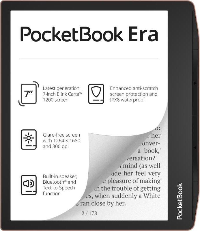 EAN: 7640152096723 - Der PocketBook Era mit neuester E-Ink Carta 1200 Bildschirmtechnik, SMARTlight und integriertem Lautsprecher ist der kompakte Allrounder von PocketBook. Der E-Reader ist wassergeschützt und verfügt über einen verbesserten Kratzschutz. Das Gerät steht in zwei Gehäusefarben und Speichergrößen zur Verfügung. Der PocketBook Era in Sunset Copper verfügt über 64 GB internen Speicher. Reflexionsfreier 7 Zoll (17,8 cm) großer E-Ink Carta 1200 Touchscreen mit 300 dpi und SMARTlight zur Regulierung von Lichtfarbe und Helligkeit Verbesserter Kratzschutz sowie Wasserschutz gemäß IPX8 für entspannten Lesegenuss auch im Badezimmer oder am Pool Integrierter Lautsprecher sowie Bluetooth-Schnittstelle zur Kopplung von kabellosen Kopfhörern oder einem Bluetooth-Lautsprecher für uneingeschränkten Hörbuchgenus Seitliche Steuertasten und freie Tastenkonfiguration zur komfortablen Bedienung für Links- und Rechtshänder sowie Lagesensor für bequemes Lesen im Querformat Unterstützung von 19 gängigen Buch-, 6 Audio- sowie 4 Bildformaten ohne Konvertierung Komfortabler Zugriff auf digitale Inhalte deiner öffentlichen Bibliothek via integrierter Onleihe-App sowie auch über Overdrive (mittels Browser) Prozessor Eingebauter Prozessor: Ja Prozessorfrequenz: 1000 MHz Funktionen Wörterbuch:Y Rotieren:Nein Wörterbuchsprachen:EnglischSpeicher Kompatible Speicherkarten:Nicht unterstützt Interne Speicherkapazität:64 GB RAM-Kapazität: 1000 MB Design Produktfarbe: Kupfer, Schwarz ... Sie erhalten mehr Ergebnisse, aktuelle Angebote und weitere Preisbereiche wenn Sie den Preisvergleich aktualisieren: Mehr pocketbook era Angebote Jetzt live Meta-Preisvergleich starten! Pocketbook era Testberichte