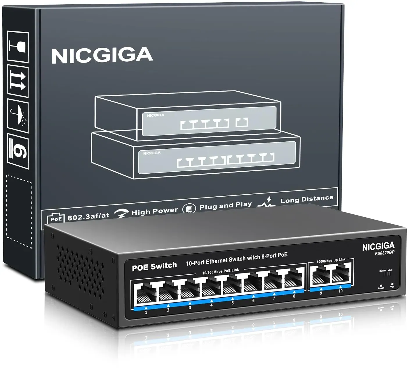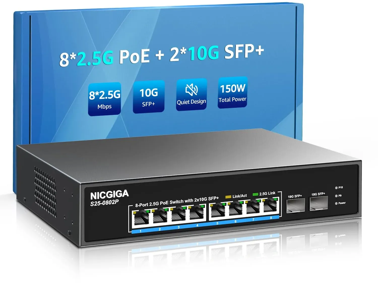 Kategorie: Netzwerk-Switches - NICGIGA - GTIN:0790885573903 - 8-Port Gigabit PoE+ Switch mit 8 PoE+ 10/100/1000 Mbps RJ45 Ports, 2 Gigabit Uplink + 2 SFP Ports. SFP Uplink Ports können mehr Bandbreite bereitstellen und verschiedene Geräte wie Router, NVRs, etc. anschließen. Unterstützt 48v IEEE 802.3af/at, jeder Port liefert bis zu 30W Leistung und ein Gesamt-PoE-Leistungsbudget von 120W. Weit verbreitet in HD-IP-Kameras, IP-Telefonen, drahtlosen Zugangspunkten, Computernetzwerkausrüstung und anderen Szenarien. Bitte beachten Sie: 12v/24v PoE wird nicht unterstützt. 4KV Blitzschutzdesign kann Produkte und Geräte vor Schäden auch bei schlechtem Wetter schützen. Mit industrietauglichem Lüfter und Metallgehäuse, um eine gute Wärmeableitung und Stabilität des Geräts zu gewährleisten. Unterstützt Desktop und Wall-Mount. Unmanaged Plug and Play, Unterstützung der Stromerkennungsfunktion, automatische Erkennung von PD-Geräten, kompatibel mit Nicht-POE-Geräten, um eine Datenverbindung herzustellen, keine Software oder Konfiguration erforderlich, Unterstützung von automatischem MDI/MDIX und nicht blockierender Datenweiterleitung. Jeder NICGIGA PoE-Switch wird streng auf Zuverlässigkeit, Qualität und Leistung getestet. Wir bieten eine einjährige und lebenslangen technischen Support für das gesamte Produkt. - 89,58 Euro bei Amazon Marketplace CE - gefunden von billiger.de Dieser NICGIGA 2.5G PoE Switch ist mit 119.99 Euro eine zukunftssichere Option mit 2.5G PoE+-Ports und 10G SFP+ Uplink für WiFi6-Umgebungen. ![]() ![]() 8 Port 2.5G PoE Switch Unmanaged with 8 Port 2.5Gb Base-T PoE+@130W + 2 x 10G SFP+ Uplink, NICGIGA 10 Port 2.5Gbe IEEE802.3af/at Power Over Ethernet Switch, Support WiFi6 AP, NAS, 4K PoE Camera NVR.