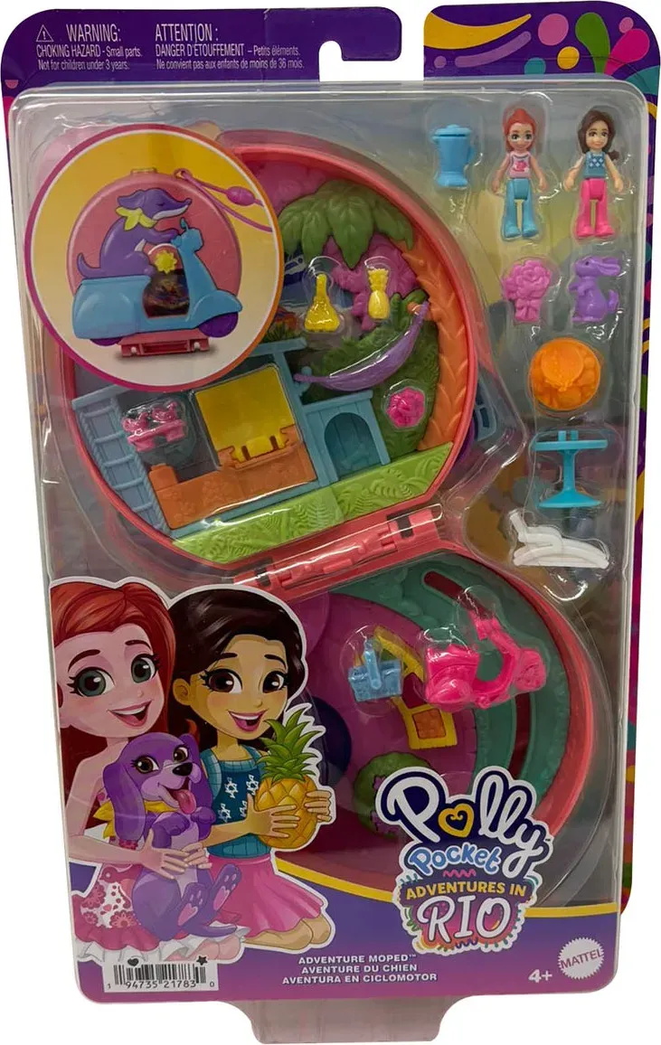 Auf Lager Versand durch AmazonPolly Pocket-Puppen und Spielset, Adventure Moped-Schatulle, Reisespielzeug mit 2 kleinen Puppen und Tier, Zubehörteile für Tier und Fahrzeug, HWN98