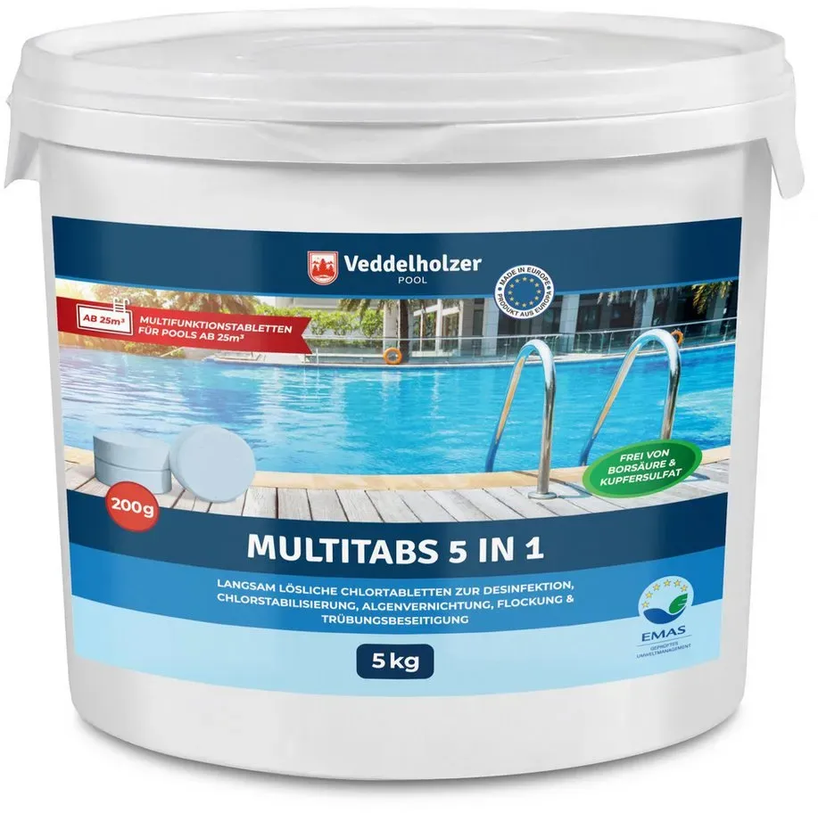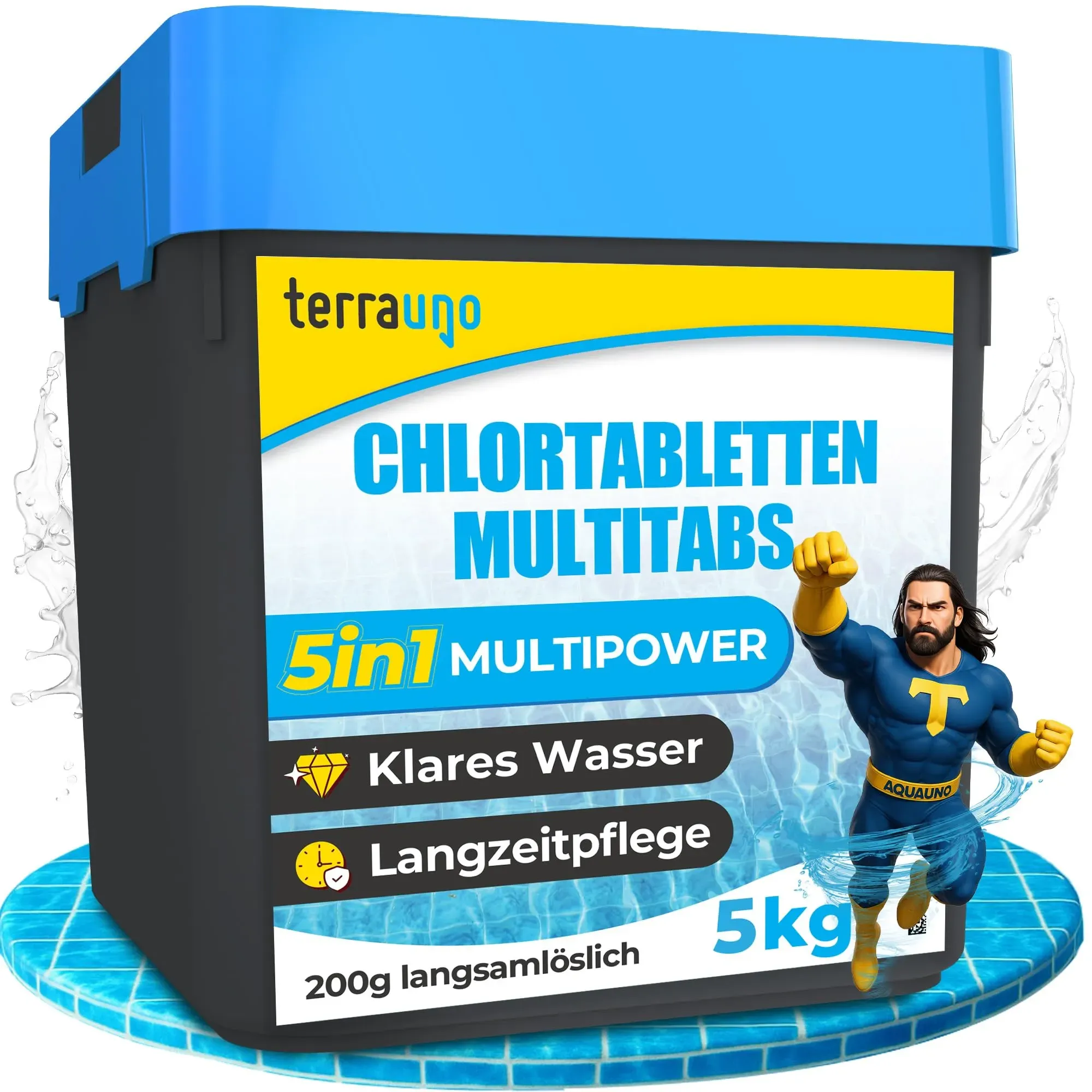 Verfügbarkeit: Auf Lager - Kategorie: Poolzubehör - TerraUno - GTIN:8720598706697 - Pool Chlor Tabletten 5-fache Wirkung mit einer Tablette : Unsere Chlor Multitabs 5 in 1 bieten eine durchdachte komplett Pflege. Sie desinfizieren, wirken gegen Algen, unterstützen die Flockung, regulieren den pH-Wert und helfen, Kalkablagerungen vorzubeugen. Langzeitwirkung für entspannte Pool Tage: Die Pool Multitabs lösen sich langsam auf und sorgen über mehrere Tage hinweg für stabile Wasserqualität €“ Pool chlor Tabletten sind ideal zur Dauerpflege von Pools und Whirlpools. Multitabs Pool Anwendung & Dosierung: pH-Wert vorab auf 7,0€“7,4 einstellen. Bei Erstdosierung 100 g/10 m3 Chlorgranulat in den Pool geben; danach wöchentlich 1 Tablette der TerraUno Pool Tabs/25€“35 m3 in den Dosierschwimmer. Bei starker Belastung, Hitze oder Trübung 200 g/10 m3. Hergestellt in Europa: Unsere Chlortabletten für Pool werden nach strengen europäischen Qualitätsrichtlinien produziert €“ ohne Borsäure, dafür mit klarem Fokus auf Sicherheit und Umweltverträglichkeit. Chlortabletten Sicher anwenden €“ Etikett beachten: Biozidprodukte vorsichtig verwenden. Vor Gebrauch stets Etikett und Produktinformationen lesen. Biozid-Registriernummer: N-117548 - 39,90 Euro bei Amazon Marketplace Lawn & Garden - gefunden von billiger.de Dieses 5 kg Paket mit langsam löslichen 200g Multitabs ist eine praktische Lösung für die Poolpflege. ![]() ![]() Veddelholzer Chlortabletten 5 kg Multitabs Langzeit Chlor 5 in 1 langsam löslich Pool Zubehör 200g, (Chlortabletten für Pool, 5 in 1 Multitabs), langzeit Chlor Tabletten zur Reinigung & Desinfektion
