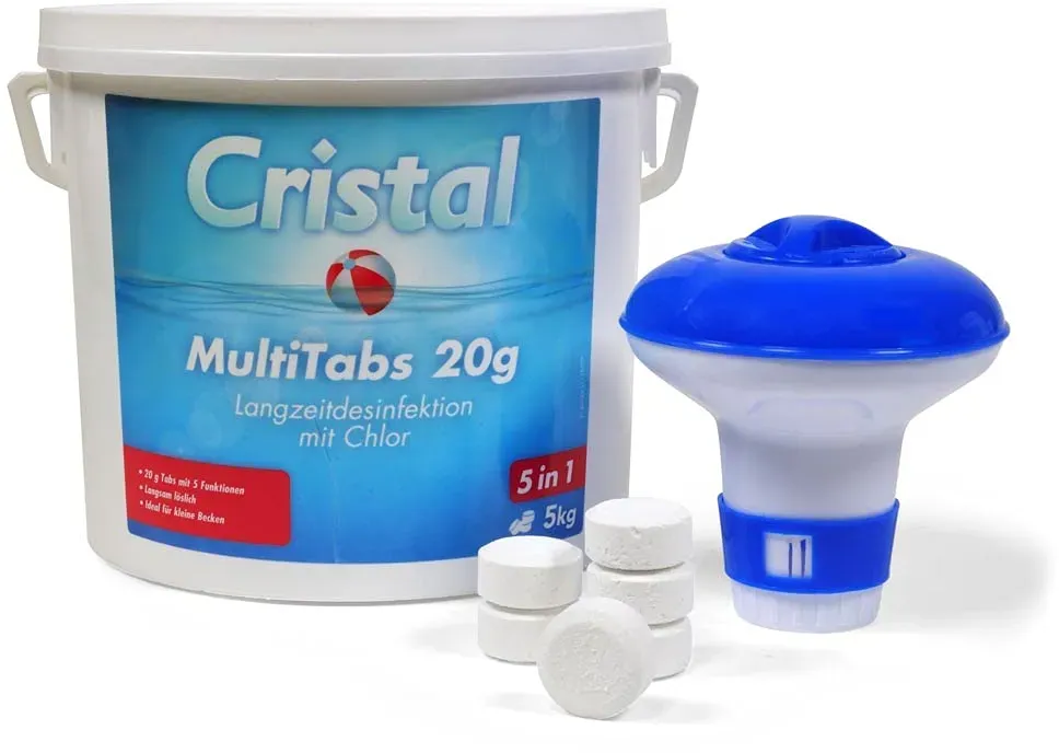 Verfügbarkeit: Auf Lager - Kategorie: Poolzubehör - POOL Total - GTIN:4251002865326 - 5 IN 1 WASSERPFLEGE: Kombiniert Langzeitdesinfektion, Algenvernichtung, Trübungsentfernung, Chlor- und Härtestabilisierung in einer 20g Tablette. LANGSAME AUFLöSUNG: rt kontinuierliche Pflege und langanhaltende Wasserqualität durch langsames Lösen der Tabletten. IDEAL FüR KLEINE POOLS: Speziell entwickelt für Poolgrößen bis zu 20 m3, perfekt geeignet für Sand- und Kartuschenfilter. EINFACHE HANDHABUNG: Einfach in den Mini Dosierschwimmer legen, verhindert Bleichflecken und rt gleichmäßige Verteilung im Wasser. PH-NEUTRAL UND KALKFREI: Schont die Haut und die Poolmaterialien, während effektiv Keime im Wasser vernichtet werden. HINWEIS: Biozidprodukte vorsichtig verwenden. Vor Gebrauch stets Etikett und Produktinformationen lesen. BAuA Reg. Nr.: N-94851. Bewahren Sie das Produkt außerhalb der Reichweite von Kindern auf. - 44,95 Euro bei Amazon Marketplace Lawn & Garden - gefunden von billiger.de Dieses 5 kg Set inklusive Chlordosierer bietet eine bequeme und effektive Lösung für die Poolpflege. ![]() ![]() POOL Total Cristal Chlor Multitabs 20 g - 5 kg Set mit Chlordosierer - Effektive 5 in 1 Poolpflege für klares Wasser - Langzeitdesinfektion für Pools