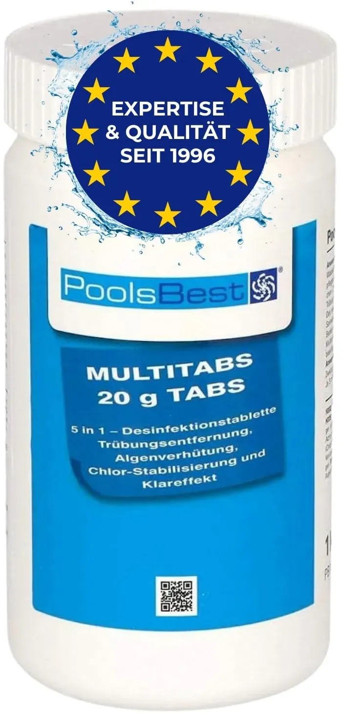 Verfügbarkeit: Auf Lager - Kategorie: Poolzubehör - nasswerk - GTIN:4068196002167 - Einfachheit trifft Effizienz - Erleben Sie mit unseren Langzeit Pool Multitabs 5 in 1 die effizienteste Art der Poolpflege. Chlor, Algenvernichter, pH Regulierung, Flockung & Reiniger in einem Produkt. Vergessen Sie die mühsame Zusammenstellung verschiedener Poolchemikalien & genießen Sie ungetrübten Badespaß. MULTI-PROTECT Formel - Unsere Pool Chlortabletten 5 in 1 wirken durch ihre innovative MULTI-PROTECT Formel absolut effektiv gegen Algen, Bakterien, Pilze und Wasserverfärbungen. Sie sorgen für kristallklares & hygienisches Wasser - Ein Muss für sauberes und hygienisches Wasser in Ihrem Pool. Die optimale Anwendung - Achten Sie vor dem Einsatz der Chlor Multitabs 5 in 1 auf ideale Wasserbedingungen: Ein pH-Wert zwischen 7,0 - 7,4 ist essentiell, zudem sollte das Wasser frei von sichtbaren Verunreinigungen sein. Um Bleichflecken zu vermeiden muss ein Dosierschwimmer / eine Dosierschleuse verwendet werden! Umweltfreundliche Verpackung - Mit den 5 in 1 Multitabs wählen Sie nicht nur sauberes Poolwasser, sondern auch Umweltschutz. Die 100% recycelten Behälter unterstreichen das Engagement für unseren Planeten. Tragen Sie zur Umweltbewahrung bei, während Sie Ihren Badespaß in vollen Zügen genießen. Hergestellt in Europa - Verlassen Sie sich auf Europäische Qualität & Sicherheit. Unsere Produkte werden in Europa nach höchsten Standards produziert und stehen für Sicherheit ... Diese Mini-Multitabs sind perfekt für kleinere Pools, Whirlpools oder Planschbecken und bieten eine All-in-One-Pflege. ![]() ![]() PoolsBest 1kg Chlor Mini Multitabs 5 in 1 I 20g Mini Chlortabletten für Pool/Whirlpool/Aufstellpool & Planschbecken I All in One Poolpflege Tabs I Reinigungstablette für Pools bis 20m3