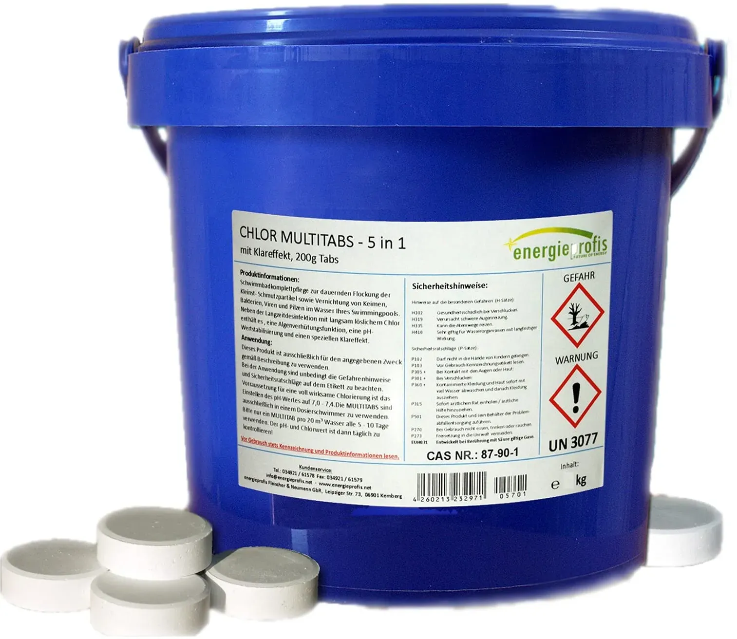 | Marke/Modell | Größe | Highlights | |--------------|--------|------------| | PoolsBest Chlor Multitabs 5 in 1 | 200 g, 5 kg | Organisches Chlor, glänzendes Wasser, rückstandsfrei.[2] | | AquaLeve 5 in 1 Chlortabletten | 20 g, 1/5 kg | Testsieger (1,1), Made in Germany.[4] | | FHS24 MultiTabs Chlor 5 in 1 | 200 g, 1 kg | Multifunktions für Poolreinigung.[5] | | Belko Chlor Multitabs 5 in 1 | 200 g, 5 kg | 5-Phasen-Programm.[7] | | Cristal MultiTabs 5 in 1 | 20 g, 1/5 kg | Langzeitdesinfektion, Algenvernichtung.[5][9] | | 7SPA 5in1 Chlor Multitab | 20 g, 1 kg | Für Whirlpools/Pools.[6] | Empfohlener PreisbereichSuchen Sie in 15-40 € pro kg (1 kg Dose: 15-25 €; 5 kg Eimer: 70-150 €, ca. 14-30 €/kg) - günstiger bei Großpackungen. Preisvergleich lohnt, da Qualität (z. B. 90 % Wirkstoffe, BAuA-registriert) variiert.[1][2][4] Vergleichen Sie aktuelle Angebote für beste Deals. Jetzt live Suche nach pool chlor 5 in 1 starten! Empfohlene Pool chlor 5 in 1 Angebote*Durch Käufe über Links zu Händlern kann diese Website eine Provision erhalten, u.a. durch das eBay Partner Network und das AmazonPartnerNetHier ist eine Auswahl von 15 repräsentativen und empfehlenswerten Treffern für "pool chlor 5 in 1", die verschiedene Preisbereiche und Arten abdecken: Dieses Produkt bietet ein gutes Preis-Leistungs-Verhältnis für 1 kg Multitabs und ist ideal für kleinere Pools. ![]() ![]() BlueViking Chlortabletten für Pool 5 in 1 - Hochwirksame Multitabs Pool 200g im 1kg Eimer - Chlor Pool Tabletten in EU Premium-Qualität - Einfache, Sichere und Effiziente Poolpflege