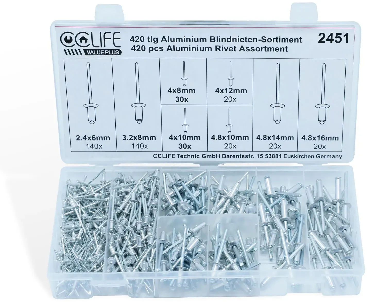 Zustand: Neu - Blindnieten - CCLIFE - 4351 - EAN: 4251249443516 - Praktisch:Unsere Aluminium-Blindniete haben eine hohe Festigkeit und hohe Scherfestigkeit, sowie hochwertige Aluminiumköpfe und stabile verzinkte Stahldorne. Inhalt:Das Produkt enthält 1000 Nieten, 260 x 2,4 x 6mm, 240 x 3,2 x 6mm, 150 x 4,0 x 6mm, 120 x 4,0 x 10mm, 160 x 4,8 x 6mm, 70 x 4,8 x 12mm, eine Vielzahl von Größen, die den Anforderungen des täglichen Gebrauchs entsprechen. Aufgeräumt:Unsere Nieten werden in einer beschrifteten Sortimentsbox mit Fächern geliefert, um die verschiedenen Größen getrennt zu halten und nicht leicht zu verwechseln, und die Box mit Tragegriff ist einfach zu tragen und kann jederzeit zugegriffen werden. Verwenden:Kompatibel mit CCLIFE und anderen handelsüblichen Blindnietzangen, die zum Verbinden und Fixieren verschiedener Metallmaterialien verwendet werden, die in Automobilen, Maschinen, Elektrogeräten, Möbeln und anderen Produkten weit verbreitet sind. Qualität:CCLIFE ist bestrebt, preisgünstige Handwerkzeugprodukte für Profis und Hobbyisten anzubieten und hofft, eine Marke zu sein, der Sie vertrauen. - Verkäufer: CCLIFE Technic GmbH im amazon.de Marketplace Dieses 650-teilige Blindnieten-Sortiment bietet eine sehr große Auswahl an Nieten für unterschiedlichste Projekte. Manomano.d e