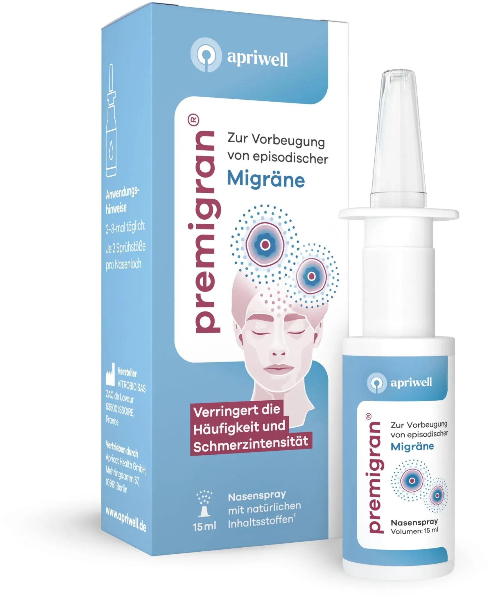 Kategorie: Nahrungsergänzungsmittel - apriwell - GTIN:4262394920272 - Wirksame Migräne-Vorbeugung: Premigran reduziert nachweislich die Häufigkeit, Dauer und Intensität von Migräne-Anfällen bei episodischer Migräne mit und ohne Aura. Die Wirksamkeit wurde durch mehrere klinische Studien belegt. Zielt auf den Trigeminus: Premigran beruhigt und schützt den überreizten Hauptnerv jeder Migräne'attacke. So blockiert es Reize aller Art - von innen und außen - bevor sie Attacken auslösen. Mehr Alltag, weniger Tabletten: Die regelmäßige Anwendung steigert die Lebensqualität und verringert die Notwendigkeit, Migränetabletten, wie Triptane, einzunehmen. Premigran kann bereits ab 1 n angewendet werden. Wirkt lokal & natürlich: Das Medizinprodukt wirkt lokal in der Nase, hat keine systemischen Nebenwirkungen, ist kompatibel mit Standard'therapien und beinhaltet Inhaltsstoffe natürlichen Ursprungs. Einfache Anwendung: Pro Nasenloch genügen 2 Sprühstöße 2 3-mal täglich, um den Schutz aufzubauen und aufrechtzuerhalten. Die erste Schutzwirkung ist bereits ab der 5. Woche spürbar. - 21,90 Euro bei Amazon Marketplace Health & Personal Care - gefunden von billiger.de ![]() ![]() PREMIGRAN Migränespray - Apriwell Nasenspray eBay 15 ML PZN 19819866