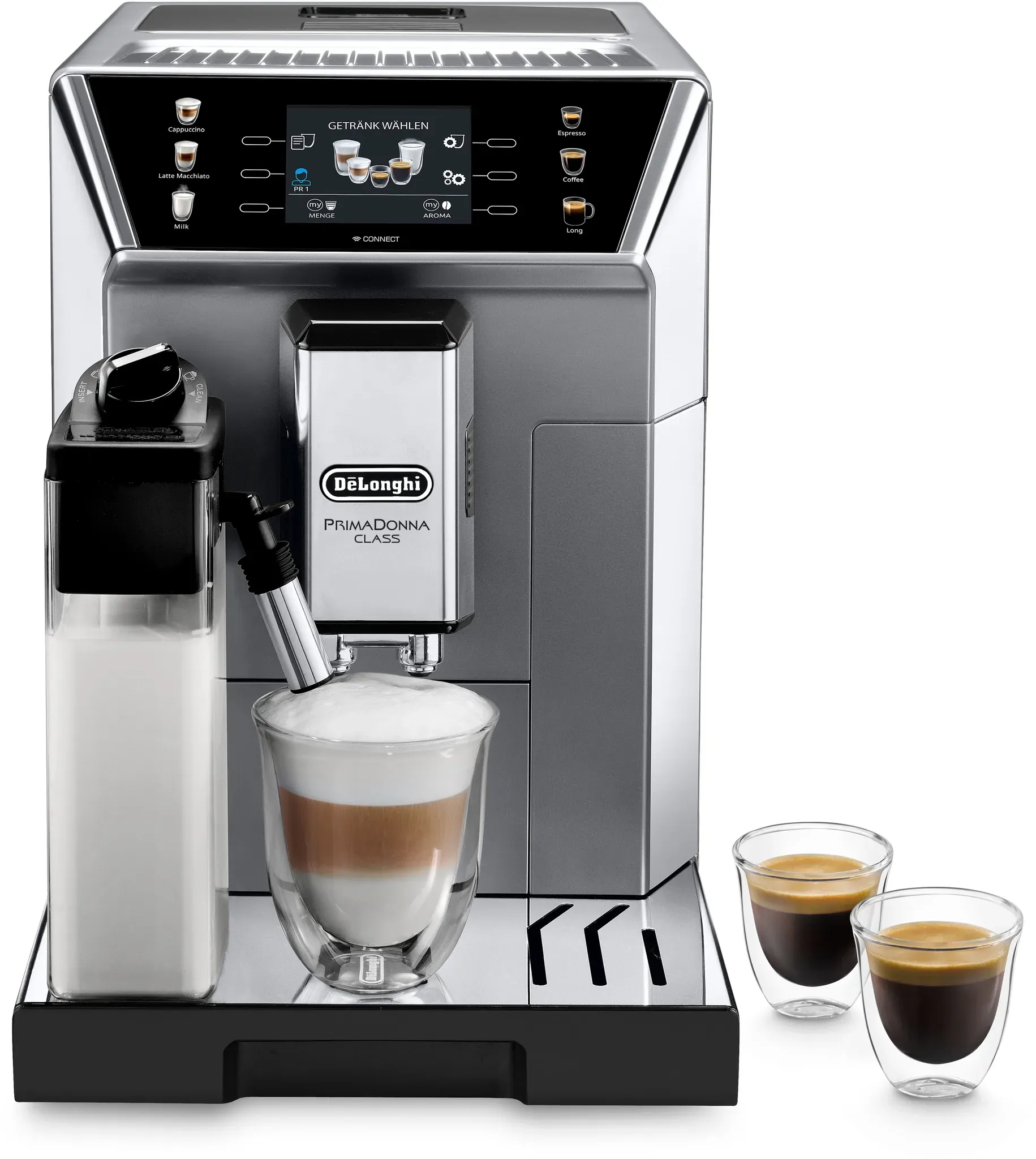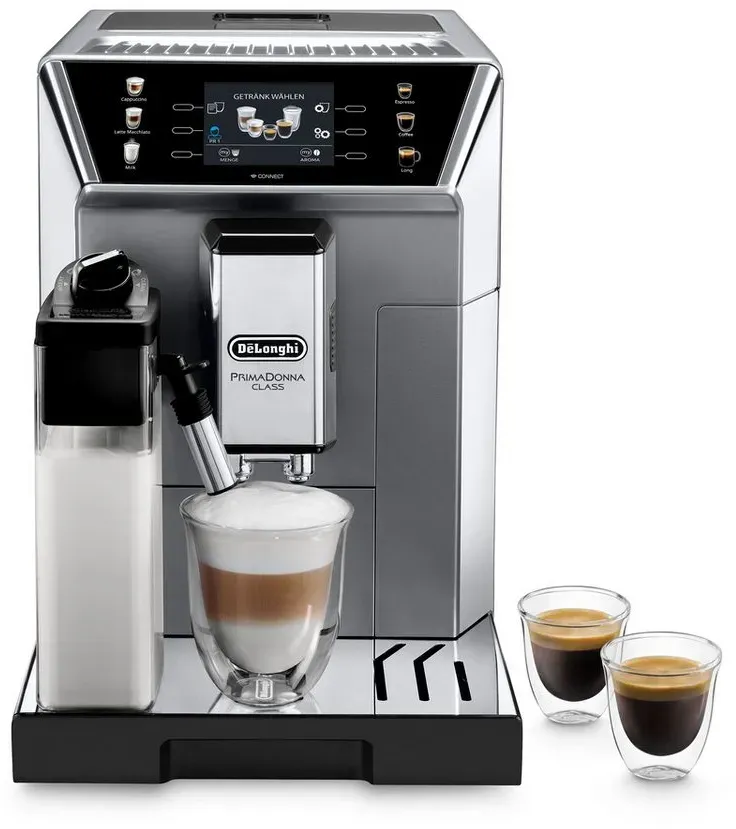 Kategorie: Kaffeevollautomaten - De'Longhi - GTIN:8004399014060 - Allgemein Weitere Vorteile , EINFACHE BEDIENUNG: Intuitive Bedienung dank 3,5 Zoll großem TFT Display und Sensor-Touch-Tasten. Individuelle Einstellung von Aroma, Kaffee-und Milchmenge für alle Getränke dank Mein Kaffee -Funktion. KAFFEE PER SMARTPHONE APP: Die kostenlose Coffee Link APP für iOS und Android bietet vielfältige Möglichkeiten der Personalisierung, Zugriff auf alle Einstellungen und unterstützt den Kaffeegenießer mit einem interaktiven Benutzerhandbuch und Pflegevideos. KOMFORT: Programmierfunktion Mein Kaffee ermöglicht individuelle Einstellung von Aroma, Kaffee- und Milchmenge für alle Getränke. 3 Benutzerprofile + 1 Gastprofil zum Speichern der persönlichen Präferenzen. Innovative Coffee Link App für individuelle Programmierung und Kreation eigener Kaffeegetränke. Frontal herausnehmbarer 2,0 l Wassertank. Höhenverstellbarer Kaffeeauslauf (84 -142 mm). LEISTUNG & HYGIENE: Doppeltes Heizsystem für schnelle Zubereitung von Milch-Kaffeegetränken und bis zu 77% Energieersparnis. Vorbrüh-Aroma-System für perfekten Kaffeegenuss. 360 g Bohnenbehälter mit Aromaschutzdeckel. Extra leises Kegelmahlwerk (13-stufig). Fünf voreingestellte Kaffeestärken von sehr mild bis sehr kräftig. Herausnehmbare wartungsarme Brühgruppe zur einfachen Reinigung. Tresterbehälter-Anzeige: nach 14 Tassen oder nach 72 Stunden. Integrierter De Longhi Wasserfilter. Vollautomatisches Spül- und Entkalkungsprogramm. Abnehmbare, ... Ein weiteres Topseller-Angebot für das Modell ECAM550.65.SB in Schwarz, ideal für Liebhaber dunklerer Designs zum gleichen attraktiven Preis. ![]() DE'LONGHI Kaffeevollautomat 'PrimaDonna Class ECAM550.65.SB - Perfekter Milchschaum, Edelstahl', schwarz, B:26cm H:36,1cm T:46,9cm, Kaffeevollautomaten, 13 Rezepte, 5 Kaffeestärken individuelle 'Mein Kaffee' Funktion, Topseller