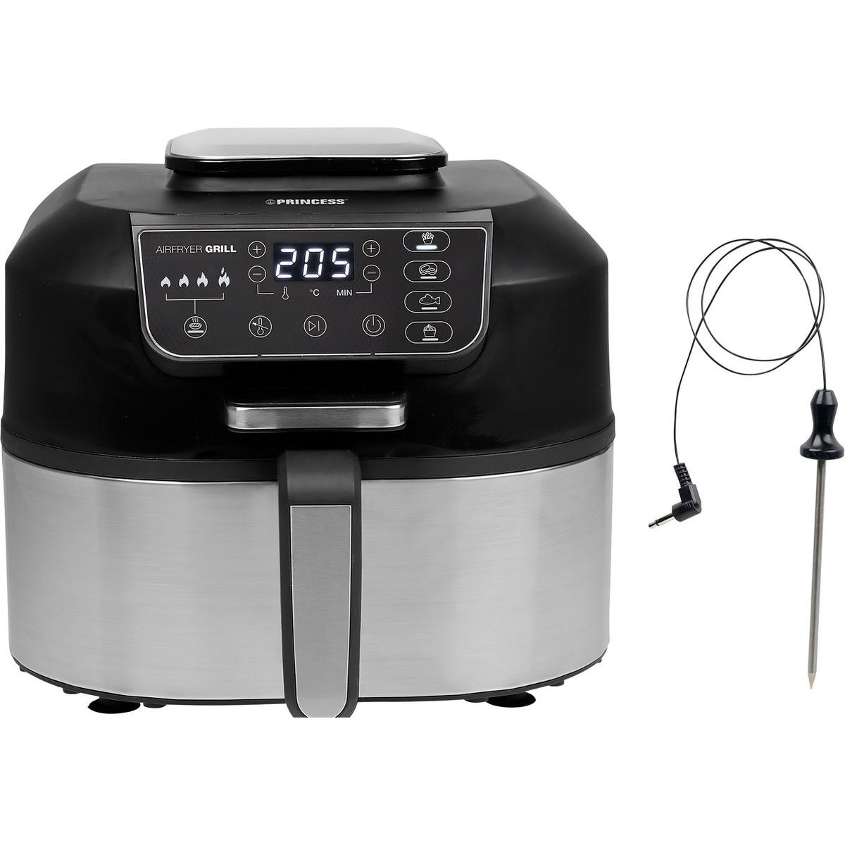 Auf Lager Versand durch AmazonPrincess 2-in-1 Heißluftfritteuse und Grill - 4 Programme - Max 265°C - Inklusive Thermometer - 1760W - Herausnehmbarer Korb - Silber/Schwarz - 182092