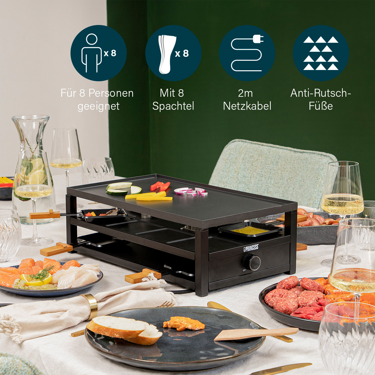 Zustand: Neu - Raclettes - Princess - 162655 - EAN: 8712836973978 - Das Raclette hat ein 1,5 Meter langes Stromkabel Mit Abstellfläche zum Abstellen der Raclette-Pfännchen bei Nichtgebrauch Inklustive 8 Holzspatel - bei Amazon.de ![]() ![]() PRINCESS Raclette Princess 162655 Black Steel Raclette €“ 8 Pers - Parkdeck für Pfännchen