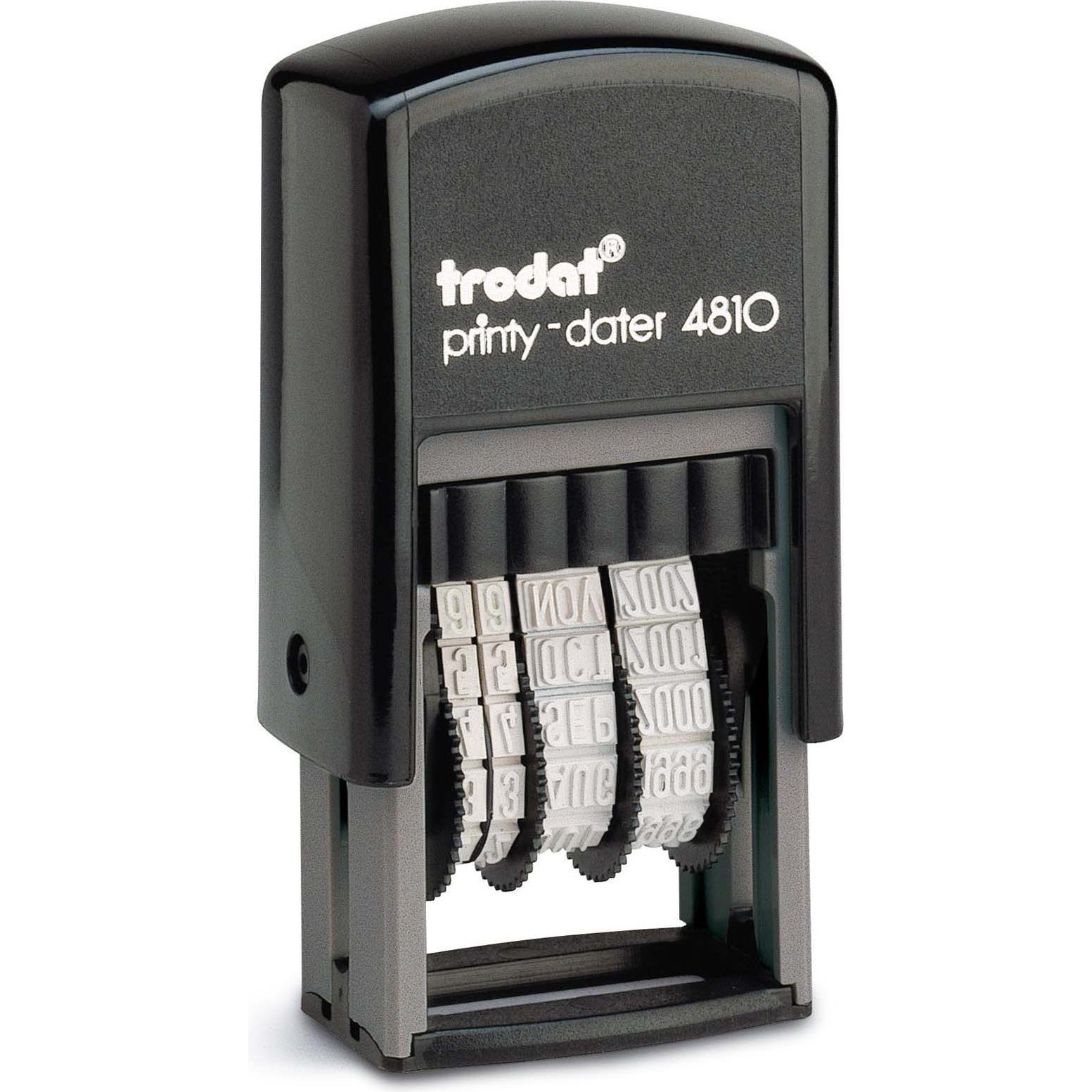 Kategorie: Sonstige Büroutensilien - Trodat - GTIN:0092399703815 - trodat Printy 4810 selbstfärbender Datumstempel - schwarz - 6,65 Euro bei Office Partner GmbH - gefunden von billiger.de Mit 7.30 Euro ist dies ein Standard-Datumstempel mit klassischer Schrifthöhe. ![]() ![]() Trodat Printy Classic 4810 (SH 3,8 mm - 20x3,8 mm) Datumstempel