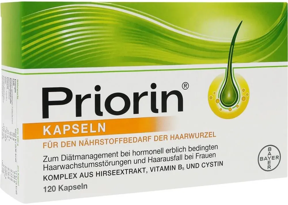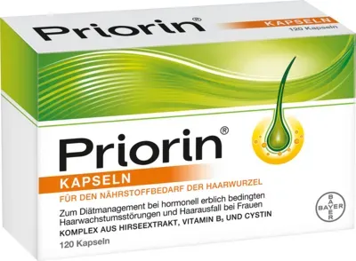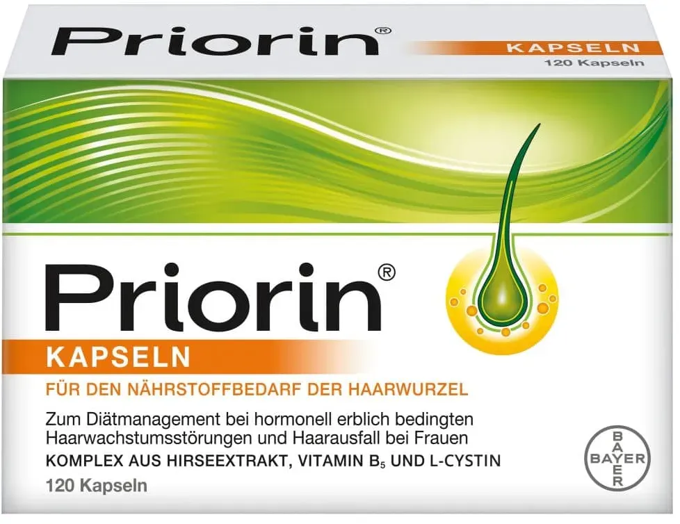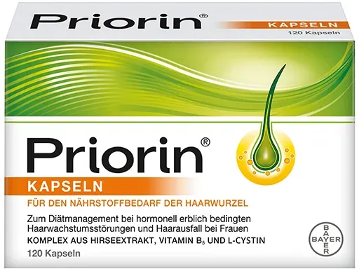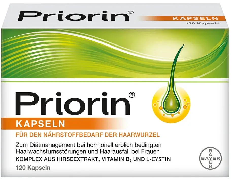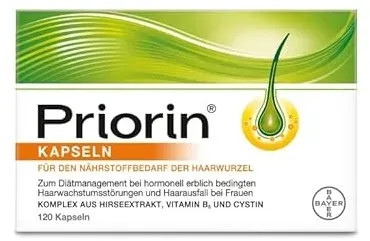 Verfügbarkeit: Lieferbar in 1-2 Werktagen - 0,32 €/St - Kategorie: Nahrungsergänzungsmittel - Bayer - GTIN:4057599005578 - PZN:04002065 - Das Sparset enthält: 2 x 270 St. Priorin KapselnPriorin® Kapseln zum Diätmanagement bei hormonell erblich bedingtem Haarausfall bei FrauenPriorin® Kapseln sind zum Diätmanagement bei hormonell erblich bedingtem Haarausfall und Haarwachstumsstörungen bei Frauen bestimmt. Mit ihrer natürlichen 3-fach-Formel aus Hirseextrakt, Vitamin B5 und L-Cystin stärken die Priorin® Kapseln die Haarwurzeln von innen und sorgen für mehr Haarwachstum sowie kräftigeres Haar. Bereits nach 12 Wochen konnten Frauen, die Priorin® Kapseln einnahmen, eine Steigerung der Anzahl der Haare in der Wachstumsphase feststellen.1 Die Anwendung erfolgt dabei ganz einfach €“ bei Haarausfall morgens zwei und abends eine Kapsel einnehmen, bei leichteren Haarwachstumsstörungen eine Kapsel täglich einnehmen.Nähren das Haar von innen: Priorin® KapselnHormonell erblich bedingter Haarausfall und Haarwachstumsstörungen sind für viele Frauen eine immense Belastung: Das Haupthaar wird lichter, die Haare wirken dünn und lassen im schlimmsten Fall sogar die Kopfhaut durchschimmern. Der Grund: Die Haarwurzeln reagieren bei den Betroffenen sensibel auf das Hormon Dihydrotestosteron (DHT) und verkümmern in der Folge. Anfangs werden dadurch die Haare um den Mittelscheitel herum weniger, im späteren Verlauf nimmt die Haardichte am gesamten Oberkopf ab.€¢ ... Dieses Angebot im Amazon Marketplace ist eine weitere gute Option für 120 Priorin Kapseln zu einem ähnlichen Preis wie direkt bei Amazon. ![]() ![]() PRIORIN Kapseln, 120 Stück