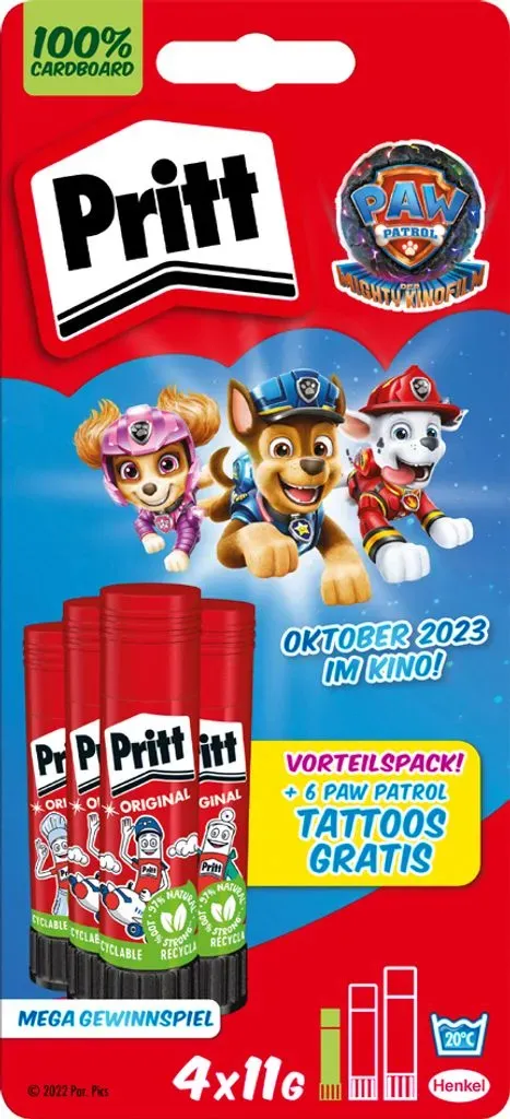 Zustand: Neu - 83,95 € / kg - Klebesticks - Pritt Henkel - 9H PBS4B - EAN: 4057278005363 - IDEAL FÜR KINDER: Die Klebestifte eignen sich perfekt für Kinder und sind ideal für die Schule zum sicheren Basteln mit Papier, Karton, Stoff, Filz oder Fotos SICHERES KLEBEN: Die Kleber sind ohne PVC und ohne Lösungsmittel und lassen sich bereits bei 20°C leicht auswaschen / Ca. 97% der Klebemasse basiert auf natürlichen Rohstoffen. HANDLICH & HALTBAR: Die Kleber sind kinderleicht anzuwenden durch feste Klebemasse und sauberem Gleiten / Dank luftdichtem Verschluss lange haltbar / aus recyceltem Plastik hergestellt (40% Recyclinganteil) und recycelbar. AUFTRAG-KONTROLLE: Die bunten Kleber haben eine farbige Klebemasse für eine optische Rückmeldung zur bereits benetzten Fläche / Die Kleber-Farbe bleibt auch nach dem Antrocknen sichtbar LIEFERUMFANG: 3 x original Pritt-Stifte mit Motiv je 11g und 1 x bunter Pritt-Stift 10g mit Motiv Achtung: Motive und Farben variieren und können nicht ausgewählt werden - 18 Händler im amazon.de Marketplace Dieses 4er-Blisterpack im "PAW PATROL" Design für 3,82 Euro ist besonders ansprechend für Kinder und Fans der Serie. ![]() ![]() Pritt Klebestift BTS 2023 "PAW PATROL" 4 x 11 g Blister