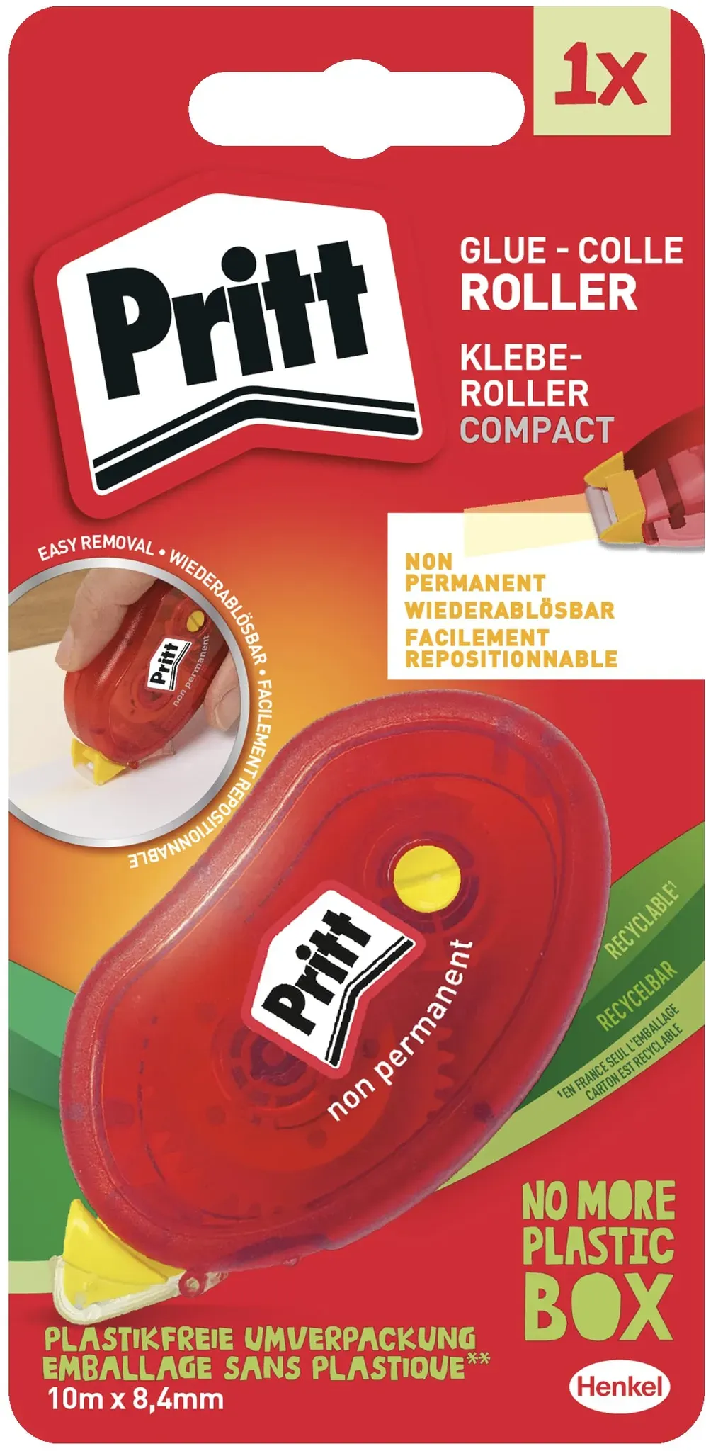 Pritt - EAN: 4015000438568 - Pritt Refillkassette, non-permanent 8,4 mm x 16,0 m - bei mindfactory.de - aus Yadore Produktdaten Dieser Compact Kleberoller ist eine sehr preiswerte Option für den Einstieg in die nicht-permanente Klebetechnik. ![]() Pritt Compact Kleberoller Non-permanent 8,4 mm x 8,5 m 2755721 10 m 5497083