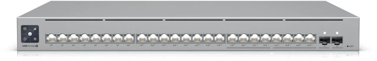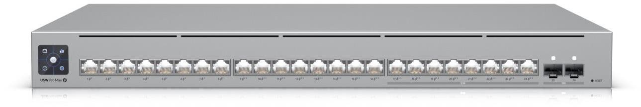 Ubiquiti - EAN: 0810084692714 - 2x 10G SFP+ Ports / 8x 2.5G Ethernet Ports (8x PoE++) / 16x 1G Ethernet Ports (8x PoE++, 8x PoE+) / 400 Watt PoE-Budget / Layer 3 Switching / Etherlighting - bei notebooksbilliger.de - aus Yadore Produktdaten jacob.de listet den Ubiquiti UniFi Pro Max 24 PoE für 732.97 Euro, der als L3-managed Switch mit PoE++ und Rackmontage vielseitig einsetzbar ist. ![]() ![]() Ubiquiti UniFi Pro Max 24 PoE - Switch - L3 - managed - 8 x 1/2,5G (PoE++) + 16 x 10/100/1000 (8 PoE+, 8 PoE++) + 2 x 10 Gigabit SFP+ - an Rack montierbar - PoE++ (400 W) (USW-PRO-MAX-24-POE)