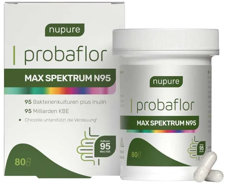 Verfügbarkeit: 1-3 Werktage - 0,63 /Stück - Kategorie: Nahrungsergänzungsmittel - nupure - GTIN:4150192902654 - PZN:19290265 - Nupure Probaflor Max Spektrum N95 80 ST - 50,20 Euro bei onfy.de - gefunden von billiger.de Dieses Angebot für 80 Kapseln bietet eine sehr hohe Bakterienkonzentration und -vielfalt, ideal für maximale Wirkung. ![]() ![]() Nupure® Probaflor MAX SPEKTRUM N95 600 Mrd. KBE/g, 95 Bakterienstämme, mit Lactobacillus, Inulin & Bifidobakterien, 95 Mrd. KBE, magensaftresistent, 80 Kapseln