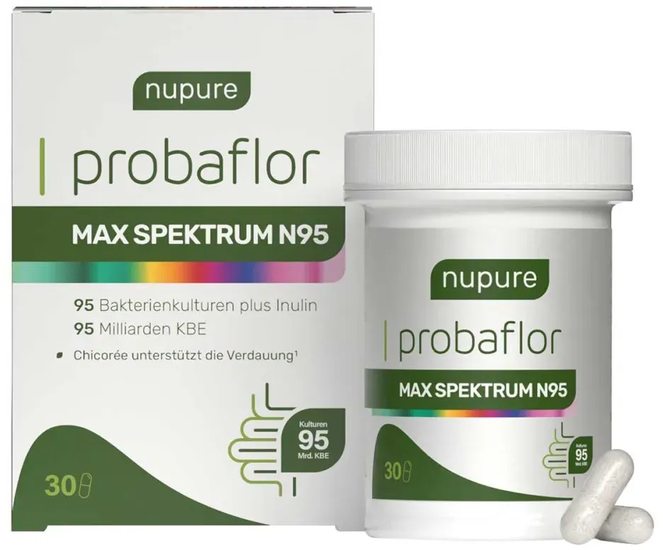 Verfügbarkeit: 1-2 Werktage, 1-2 Werktage - 0,98 /Stück - Kategorie: Nahrungsergänzungsmittel - nupure - GTIN:8721082482080 - PZN:19290271 - NUPURE probaflor Max Spektrum N95 magensaftr.Kaps. 30 St - 29,54 Euro bei Preisapo - gefunden von billiger.de Dieses Angebot bietet 30 Kapseln mit einer hohen Bakterienstamm-Vielfalt und -Konzentration zu einem guten Preis. ![]() ![]() Nupure® Probaflor MAX SPEKTRUM N95 600 Mrd.KBE/gr95 Bakterienstämme größtes Bakterienstamm-Spektrum, mit Lactobacillus & Bifidobakterien, 95 Mrd. KBE, magensaftresistent, 30 Kapseln