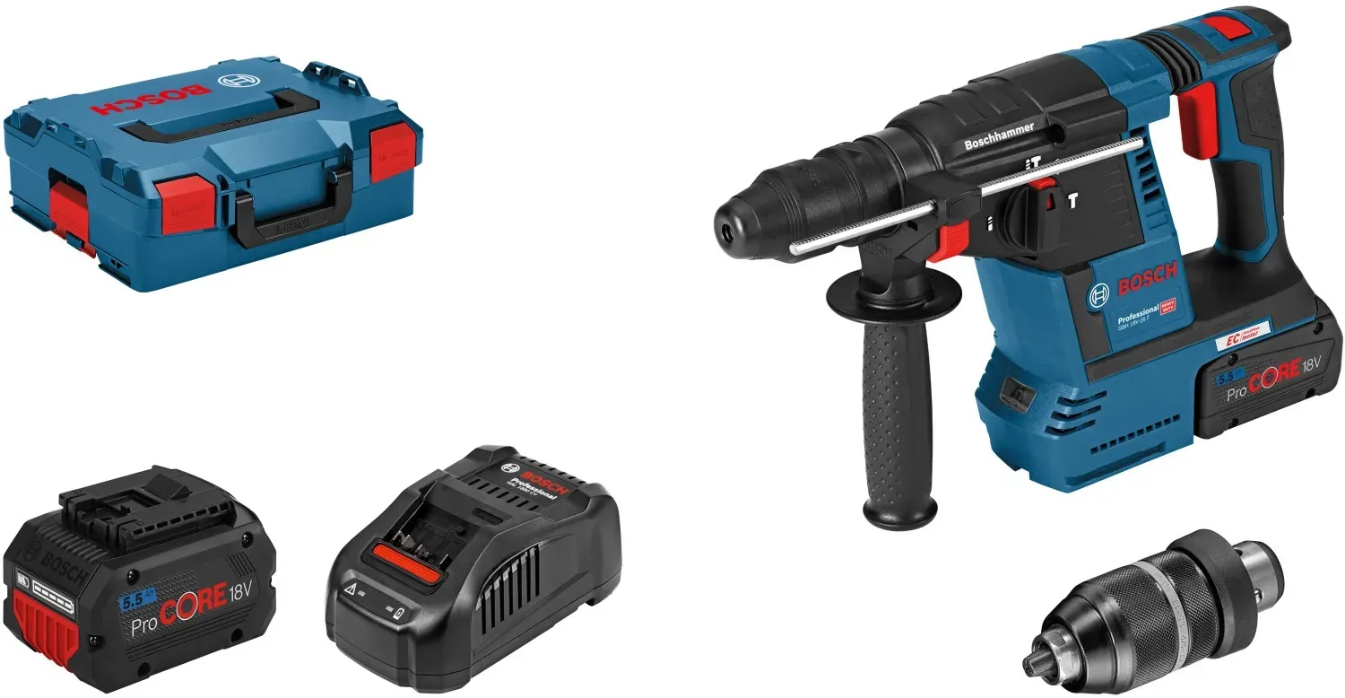 Auf Lager Versand durch AmazonBosch Professional 18V System Combo Kit: GSR 18V-90 C + GDR 18V-210 C + GBH 18V-24 C + GOP 18V-28 (inkl. 1x Akku ProCORE 4.0Ah, 2x Akku ProCORE 5.5Ah, Ladegerät GAL 1880 CV, L-BOXX)