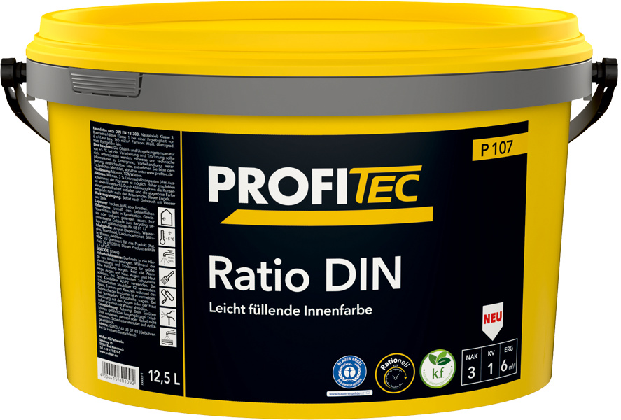 EAN: 4006415801092 - P 107 Ratio DINEmissionsminimierte InnenfarbeRationelle Innenfarbe, leicht füllend für stumpfmatte Wand- und Deckenbeschichtungen speziell im Objektbereich.AnwendungsbereichLeicht füllende Dispersions-Innenfarbe für die rationelle Beschichtung von Wand- und Deckenflächen im Objektbereich. Der Anstrich ist diffusionsfähig, haftfest und spannungsarm. Geeignet auf Putzen der Mörtelgruppen P II und P III, Gipsputzen der Mörtelgruppe P IV, Beton-/Faserzementplatten, Raufaser sowie Strukturtapeten aus Vinylschaum oder Papier und Gipskartonplatten. Im Renovierungssektor wird oft mit nur einem Anstrich ein sehr gutes Ergebnis erzielt.EigenschaftenGutes DeckvermögenLeichte VerarbeitungGleichmßiges OberflächenbildDiffusionsoffenEmissionsminimiertLösemittel- und weichmacherfreiWasserverdünnbar und geruchsarmLeicht füllendStumpfmattes OberflächenbildFarbtonweißAbtönenMit ProfiTec Vollton- und Abtönfarbe P 700 abtönbar. Durch Abtö-nung sind Abweichungen bei den technischen Kenndaten möglich.VerbrauchCa. 145 ml/m pro Beschichtung auf glatten, leicht saugenden Unter-gründen. Auf rauen Untergründen entsprechend mehr. Die genauen Verbrauchswerte durch Probebeschichtung ermitteln.VerdünnungMit Wasser maximal 10%.Trockenzeitüberstreichbar nach 4 Stunden bei + 20 C und max. 65% rel. Luft-feuchte. Belastbar nach ca. 3 Tagen. Bei niedrigerer Temperatur und höherer Luftfeuchte verlängern sich diese Zeiten.Technisches Merkblatt Signalwort: Achtung Gefahrenhinweise: Kann ... ![]() ![]() ProfiTec DINweiß 12.5l