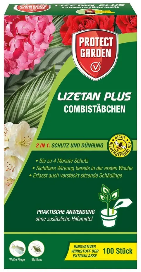Kategorie: Pflegemittel & Schädlingsbekämpfung - SBM - LIFE SCIENCE - GTIN:3664715039037 - Die neuen Lizetan Plus Combistäbchen sind Schädlingsbekämpfung und Düngestäbchen in Einem, sie bekämpfen effektiv Blattläuse, Weiße Fliege und weitere Schädlinge an Zimmerpflanzen und Balkonpflanzen. Wirkstoff der neuesten Generation - Sichtbare Wirkung gegen Schädlinge bereits nach einer Woche, sowie ein Langzeitschutz bis zu 4 Monaten für alle Topfpflanzen und Kübelpflanzen Einfache Anwendung - Die Stäbchen werden in die Erde gesteckt und die Erde anschließend gut gegossen. Der Wirkstoff verteilt sich über den Saftstrom in alle Bereiche der Pflanze und bekämpft so auch versteckt sitzende Schädlinge. Inklusive Premium Dünger - Lizetan Plus Combistäbchen enthalten den Premium Dünger NutriONE - für eine optimale Versorgung mit allen wichtigen Nährstoffen und Mineralien für satt-grüne Blätter und bis zu dreimal mehr Blüten. Nicht bienengefährlich - der innovative, exklusive Wirkstoff neuester Generation wirkt aufgrund seiner einzigartigen Struktur gezielt gegen Schädlinge und schont gleichzeitig Nützlinge. Pflanzenschutzmittel vorsichtig verwenden. Vor Verwendung stets Etikett und Produktinformationen lesen. Warnhinweise und Symbole beachten. Wirkstoffe: 18,8 g/kg Flupyradifuron + NPK-Dünger 7-4-6 Reg-Nr.: 008694-00. - 36,99 Euro bei Amazon Marketplace Lawn & Garden - gefunden von billiger.de ![]() ![]() Protect Garden - Lizetan Plus eBay Combistäbchen 100 Stück