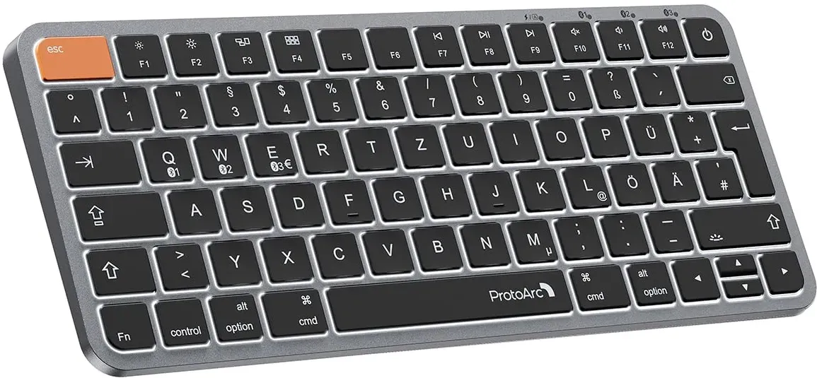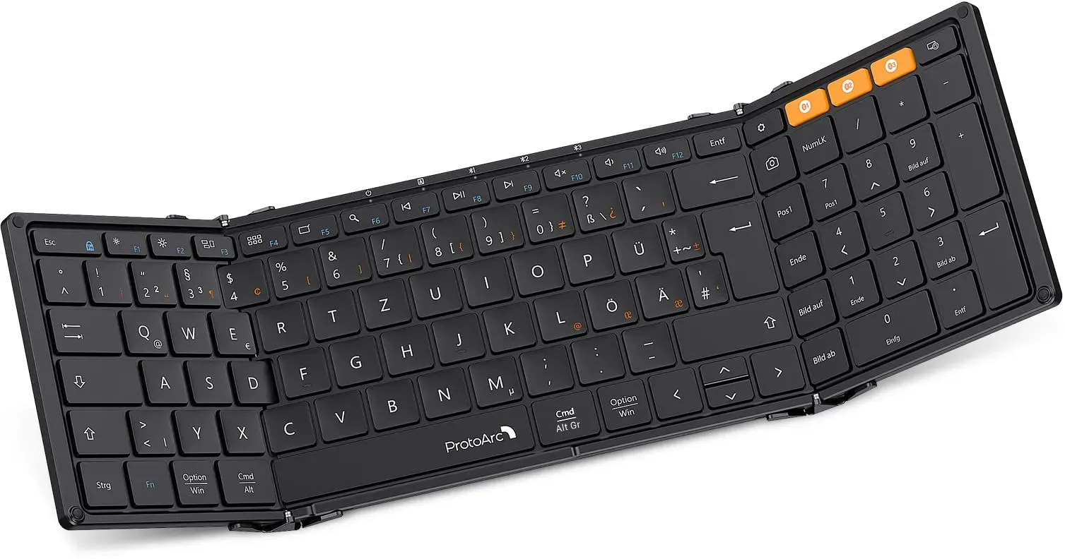 Verfügbarkeit: Auf Lager - Kategorie: Tastaturen - protoarc - Echte Fullsize Faltbare Tastatur: Andere faltbare Tastaturen, die als normalgroße Tastaturen beworben werden? Aber das sind alles kleine Tastaturen, die unbequem zu benutzen sind! Unsere ProtoArc XK01 tragbare Bluetooth-Tastatur mit 105-Tasten-Layout und Nummernblock (Ungefaltetes Format: 38.5 x 11.8 x 1.2CM). Sie können sich an das Deutschem QWERTZ-Layout anpassen und überall in den Arbeitszustand eintreten(Gleiches Layout wie bei einem Laptop, größer als jede andere Klapptastatur). Die rutschfesten Pads an der Unterseite halten die Tastatur ausgeglichen und stabil, sie wird sich beim Tippen nicht bewegen Extra Grosses Tastenkappendesign: Unsere faltbare Tastatur hat eine Größe: 0.67in / 17mm, andere faltbare Tastaturen haben eine Größe: 0.55in / 14mm. Das große Tastenkappendesign macht die Tasten größer und auffälliger, ohne dass man sie versehentlich oder falsch drücken kann. Sie können jede Taste genauer positionieren und drücken, was die Genauigkeit und Effizienz beim Tippen verbessert Bluetooth Tastatur Multi Device: Mit ProtoArc Mini Bluetooth Tastatur können Sie bis zu 3 Geräte gleichzeitig über Bluetooth koppeln. Einfacher Wechsel per Knopfdruck. Kompatibel mit Windows-, Mac OS-, iOS- oder Android-Geräten, können Sie nahtlos mit Ihrem iPad, Telefon, Tablet oder Laptop arbeiten(Wir empfehlen, die Tastatur auf einer flachen Oberfläche zu verwenden, da das Klappscharnier nicht ... Diese beleuchtete, kompakte Tastatur ist besonders für Mac-Nutzer geeignet, die eine leise und wiederaufladbare Mehrgeräte-Tastatur suchen. ![]() ![]() ProtoArc Beleuchtet Kompakte Kabellose Tastatur für Mac, K90-A Bluetooth QWERTZ Funk Tastatur, Mehrgeräte-Gerät, Aufladbar, Leise Wireless Keyboard Kompatibel mit MacBook Pro/Air, iPad, iPhone