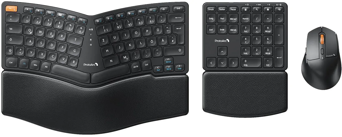 Verfügbarkeit: Auf Lager - Kategorie: Zubehör für Eingabegeräte - protoarc - Flexibles Set: Dieses 3-in-1 Tastatur Maus Set kabellos ergonomisch eignet sich für verschiedene Einsatzszenarien ob im großzügigen Büro oder auf engem Raum, ob am Desktop-PC oder Laptop: Die ergonomische maus und tastatur mit separatem Ziffernblock bietet maximale Produktivität und effiziente Platzausnutzung. Ergonomisches Komfortdesign: Die ergonomic keyboard verfügt über ein geschwungenes, geteiltes Tastendesign, das Handgelenke und Unterarme in eine natürlichere und entspanntere Haltung bringt. Geformte Scherenmechanik-Tasten passen sich optimal der Fingerform an und ermöglichen schnelle Reaktionen bei jedem Tastendruck. Maximaler Komfort und Produktivität für ganztägiges Tippen. Handballenauflage aus Leder: Die gebogene Handballenauflage mit Lederoberfläche sorgt für langanhaltenden Tippkomfort mit mehr Handgelenkunterstützung und weniger Beugung im Vergleich zu Standardtastaturen ohne Auflage. Zwei verstellbare Neigungsfüße auf der Unterseite der Auflage bringen die tastatur ergonomisch kabellos in einen idealen Winkel, um das Handgelenk auch im Stehen in einer entspannten Position zu halten. Individuell anpassbare Einrichtung: Der separate Ziffernblock bietet mehr Flexibilität beim Einrichten des Arbeitsplatzes und trägt erheblich zur Steigerung der Produktivität bei. Ein USB-Anschluss für 3-in-1-Set: Die ergonomische maus und tastatur kabellos set funktioniert ... Diese Hülle mit Tastatur und großem Präzisions-Trackpad ist eine hervorragende Ergänzung für iPad-Nutzer, die ihr Tablet in ein Notebook verwandeln möchten. ![]() ![]() ProtoArc TK500 Hülle mit Tastatur für iPad Air 11" M3 2025/M2 2024, Magnetisch Abnehmbar iPad Tastatur für Air 5/4, Pro 11 4/3/2/1, Großem Präzisions-Trackpad, QWERTZ DE-Layout - Grau