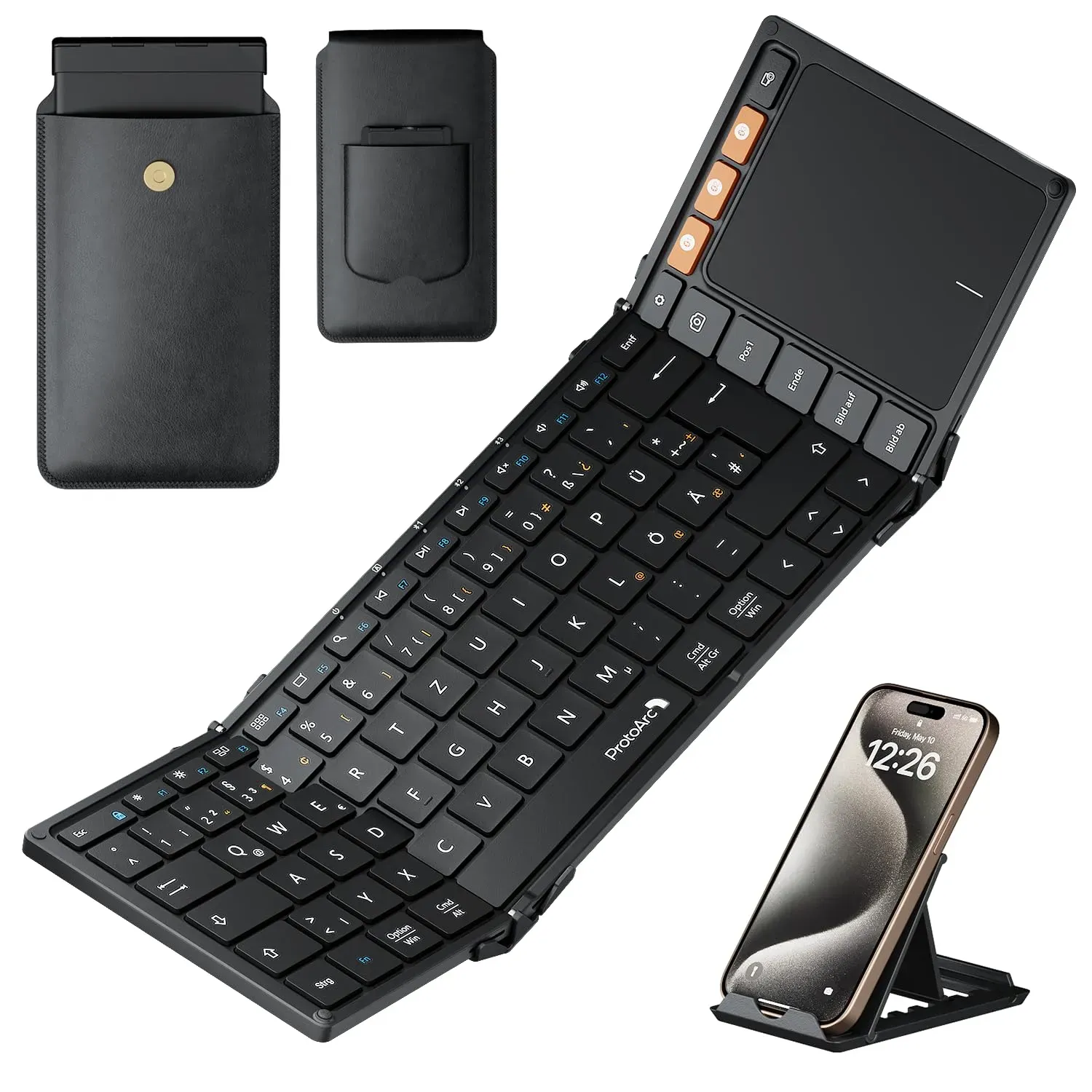 Verfügbarkeit: Auf Lager - Kategorie: Tastaturen - protoarc - Ergonomische Maus und TastaturFür lange Tipp-Sessions konzipiert, verfügt die kabellose Tastatur über eine nicht abnehmbare Handgelenkstütze, die Stabilität gewährleistet und Verrutschen während der Nutzung verhindert ideal für langfristige, feste Arbeitsplätze. Zusammen mit der leichten kabellosen Maus mit Handshake-Winkel reduziert das Set zusätzlich die Handgelenkbelastung und sorgt für komfortable, bequeme Nutzung. Wechsel zwischen 3 GerätenDas ergonomische Tastatur- und Maus-Set unterstützt 2,4 GHz und Bluetooth-Verbindungen, um einfach zwischen Laptop, Tablet und PC mit einem Knopfdruck zu wechseln. Kompatibel mit Windows 7/8/10/11, Mac OS X 10.12+ und Android 5.0+. (Hinweis: 2.4G unterstützt nur Windows, Bluetooth erkennt automatisch alle Systeme.) Wiederaufladbar & EnergiesparendWiederaufladbare Tastatur- und Mauskombination mit integrierten Lithiumbatterien (500mAh für die Tastatur und 300mAh für die Maus) bietet das Set bis zu 45 Tage Nutzung pro Ladung. Einfaches Laden über das mitgelieferte Typ-C-Kabel und intelligentes Energiesparen mit dem automatischen Schlafmodus nach 60 Minuten Inaktivität. Vollständige QWERTZ-Tastatur mit 13 Multimedia-Tasten Diese computer tastatur (430Ã94,9Ã11,73 mm) bietet ein vollständiges Layout mit Ziffernblock und 13 Multimedia-Tasten für die schnelle Steuerung von Lautstärke, Helligkeit und Wiedergabe. Perfekt für effiziente ... Diese faltbare Tastatur mit Ziffernblock ist ideal für Nutzer, die unterwegs nicht auf volle Funktionalität verzichten möchten. ![]() ![]() ProtoArc XK01 Faltbare Tastatur Klappbar mit Ziffernblock | Wiederaufladbare Kabellose Mini Tastatur mit 3 Bluetooth Kanälen für iOS, Android, Windows, QWERTZ - Schwarz