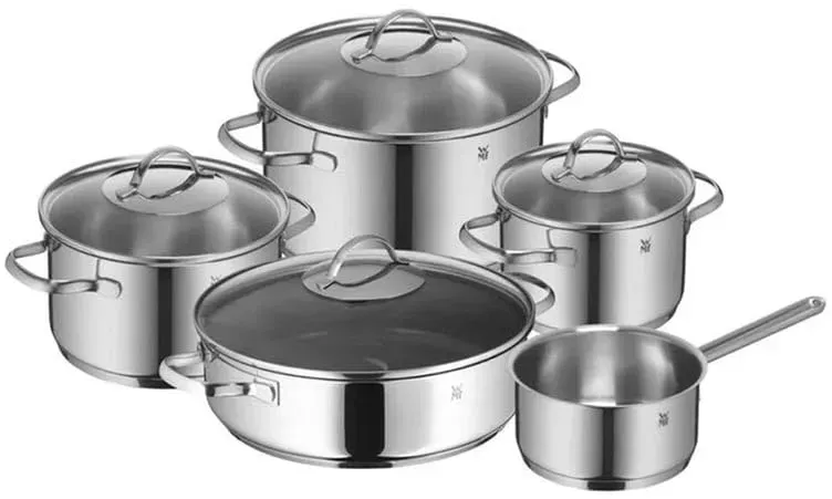 Kategorie: Töpfe - WMF - GTIN:4000530650139 - Inhalt: 1x Bratentopf mit Deckel 20 cm (V 2,5l), 2x Fleischtopf mit Deckel 16 cm (V 2,0l), 24 cm (V 5,7l), 1x Stielkasserolle ohne Deckel 16 cm (V 1,7l) - Artikelnummer: 0723046380 Material: Cromargan Edelstahl 18/10, poliert, unbeschichtet - rostfrei, spülmaschinengeeignet, hitzebeständig und backofengeeignet bis 250 C (mit Deckel 180 C). Glas Die Töpfe ohne Skalierung können auf allen gängigen Herdarten verwendet werden: Induktionsherd, Gasherd, Elektroherd, Glaskeramikherd. Dank der optimalen Wärmeverteilung brennt nichts an Die genieteten Griffe des Edelstahl-Kochtopfs bieten einen sicheren Halt und werden erst nach längerer Kochzeit heiß. Der Glasdeckel ohne Dampföffnung ermöglicht es den Garvorgang zu beobachten Die Bodenkonstruktion (TransTherm) sorgt für eine gleichmäßige und lange Wärmespeicherung. So kann während dem Kochen Energie und Zeit gespart werden - 114,42 Euro bei Amazon Marketplace Home - gefunden von billiger.de Dieses 5-teilige Induktions-Topfset ist ein Bestseller auf Amazon und bietet eine solide Grundausstattung zu einem attraktiven Preis. ![]() ![]() WMF Provence Plus Topfset Induktion 5-teilig, Kochtopf Set unbeschichtet mit Glasdeckel, für alle Herdarten geeignet, Induktions Töpfe Set, ohne Skalierung, Cromargan Edelstahl poliert