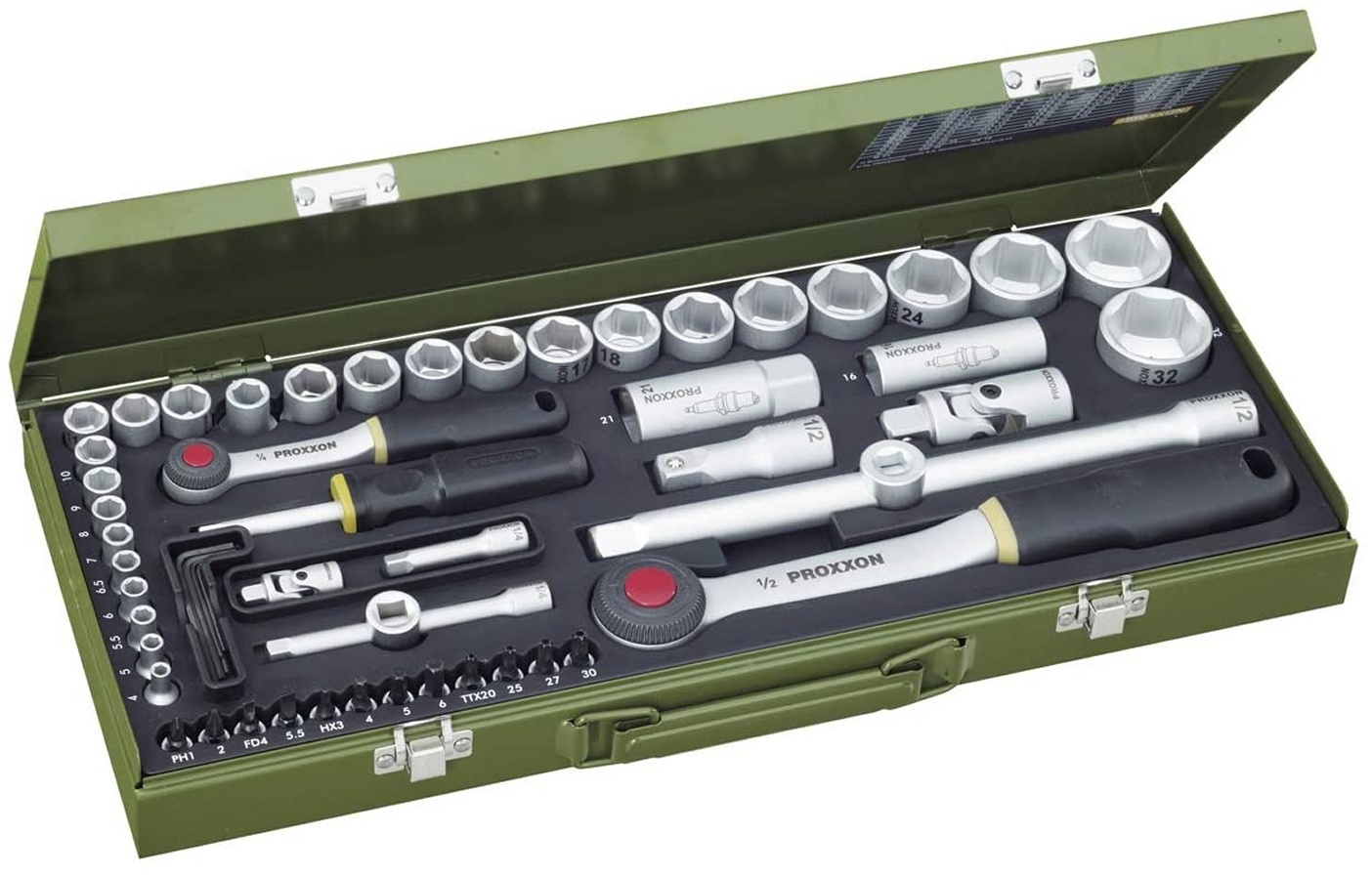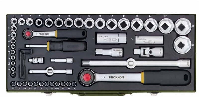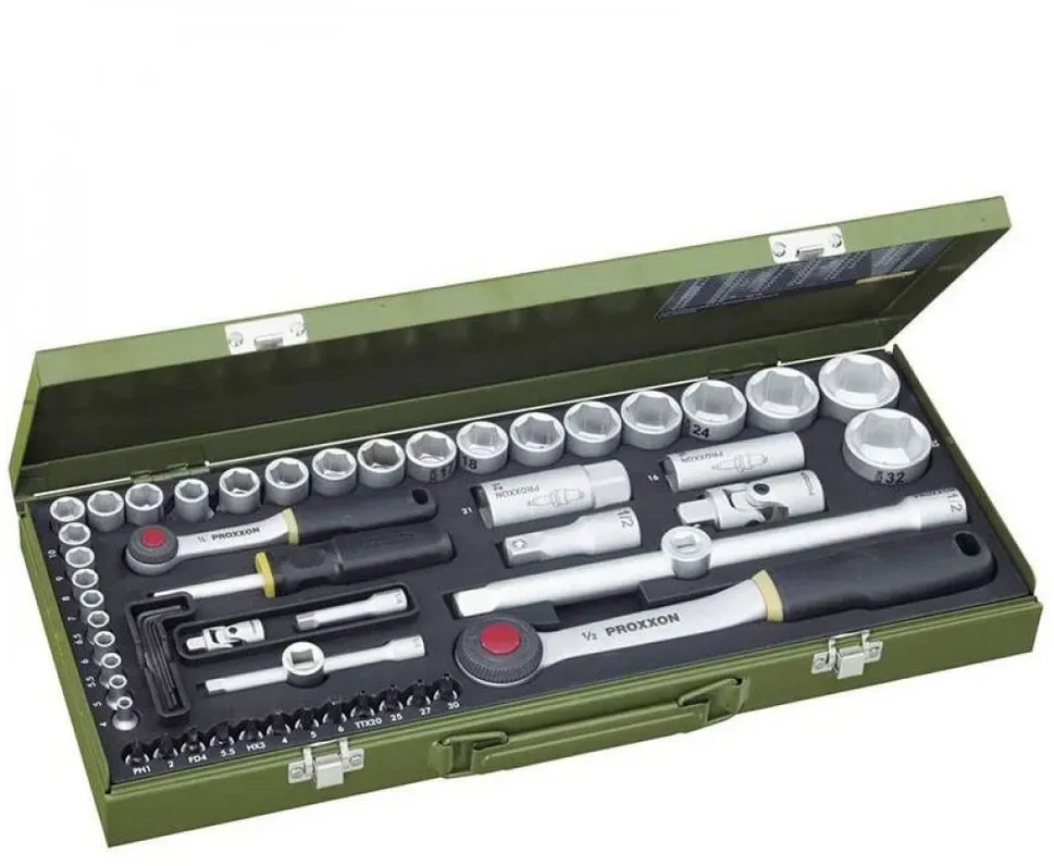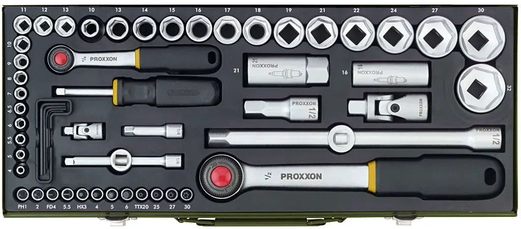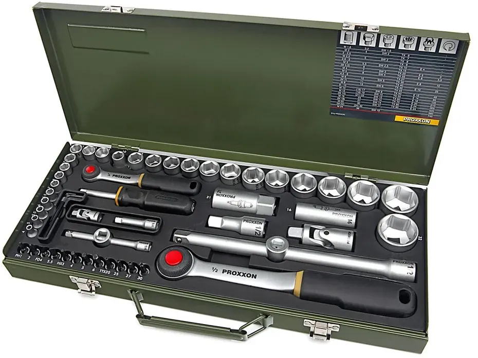 Proxxon - EAN: 4006274230408 - . 2 Umschaltknarren mit 52 Zähnen, Rändelrad und Auslöseknopf . Hochwertiges Qualitätswerkzeug aus Chrom-Vanadium-Stahl . Stabiler, pulverbeschichteter Stahlkasten mit Formeinlage (ölfest, säurefest und leicht zu reinigen) . Schraubendrehergriff mit 1/4'-Aufnahme zum Aufsetzen einer Ratsche . Inklusive Verlängerungen für tiefliegende Muttern und Schrauben Merkmale: Werkzeugaufnahme: 1/2 Zoll, 1/4 Zoll Schlüsselweite: 4 mm, 5 mm, 5,5 mm, 6 mm, 6,5 mm, 7 mm, 8 mm, 9 mm, 10 mm, 11 mm, 12 mm, 13 mm, 14 mm, 15 mm, 16 mm, 17 mm, 18 mm, 19 mm, 21 mm, 22 mm, 24 mm, 27 mm, 30 mm, 32 mm weitere Produktinformationen: Verlängerung (1/4 Zoll): 50 mm, 100 mm Länge Verlängerung (1/2 Zoll): 64 mm, 250 mm Länge Kardangelenk mit Kugel Innenvierkant, Außenvierkant: 1/4 Zoll, 1/2 Zoll Zündkerzeneinsätze (1/2 Zoll): 16 mm, 21 mm Schraubendrehergriff: 1/4 Zoll Vierkant Material: Chrom-Vanadium-Stahl Maße: (BxTxH) 450 x 200 x 55 mm Gewicht: 5,66 kg Lieferung: inkl. 56 Teile mit Stahlkasten und Formeinlage (2x Umschaltknarre, Schraubendrehergriff Vierkant, 4x Verlängerung, 2x Kreuzgelenk, 2x Kardangelenk, 2x Zündkerzeneinsatz, 14x 1/2 Zoll und 12x 1/4 Zoll Steckschlüssel, 4x Innensechskant-Bit, 2x Schlitz-Bit, 2x Kreuzschlitz-Bit (PH - Philips), 4x Torx-Bit, 5x Sechskantschlüssel (1,25 - 3mm)) - bei bueromarkt-ag.de - aus Yadore Produktdaten Dieses Angebot von Amazon.de ist sehr preiswert und bietet den beliebten Steckschlüsselsatz mit 56 Teilen. ![]() ![]() Proxxon 23040 Steckschlüsselsatz, Komplettkasten mit 6,3mm (1/4") & 12,5mm (1/2") Umschaltratsche Nüsse von 4-32mm 56teilig Werkzeug Set Stahlkasten