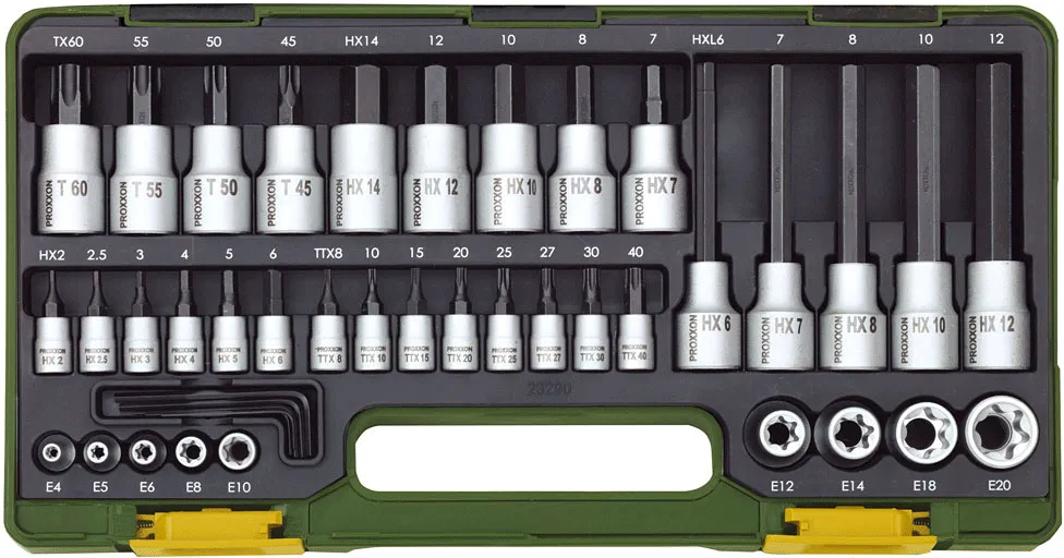 Proxxon - EAN: 4006274232907 - Proxxon Steckschlüsselsatz HX + TX (23290) - bei galaxus.de - aus Yadore Produktdaten Bueromarkt-ag.de hat den Proxxon Steckschlüssel 23290, 42-teilig, mit E4-E20 Schlüsselweite für 67.98 Euro im Angebot, was ein gutes Preis-Leistungs-Verhältnis darstellt. ![]() ![]() Proxxon Steckschlüssel 23290, 42-teilig, E4-E20 Schlüsselweite, 1/2 und 1/4 Zoll
