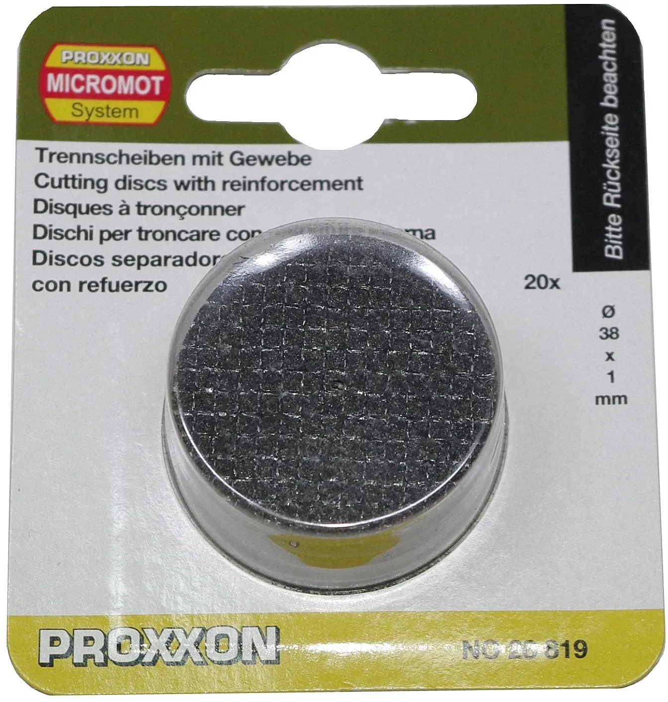 Kategorie: Zubehör für Elektrowerkzeug - PROXXON - GTIN:4006274288195 - Größe: 38 mm 1 Stück Packung mit 20 Stück - 9,97 Euro bei Amazon Marketplace Automotive - gefunden von billiger.de ![]() ![]() PROXXON 28819 Trennscheibe mit Gewebebindung 38mm, 20 Stück