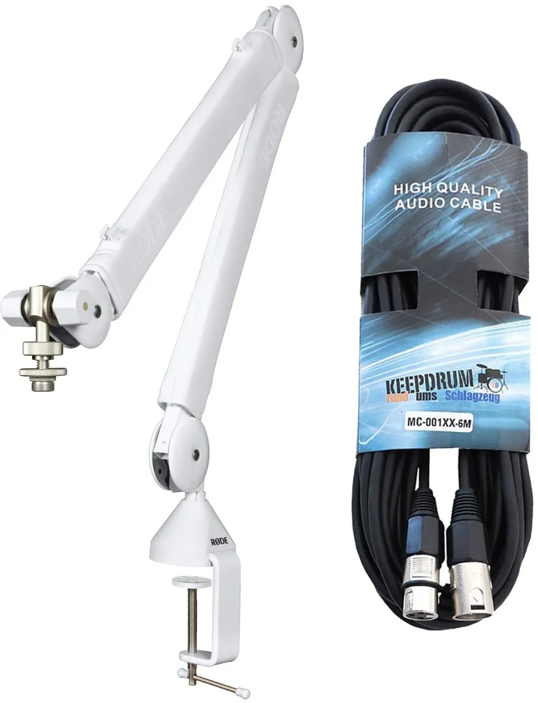 Tontechnik Mikrofone Mikrofone Zubehör Rode DJ-Ausstattung - Rode PSA1+W Gelenkarmstativ, weiß Professionelles Gelenkarmstativ für Rundfunk- und Synchronstudios, Podcaster, Gamer und andere Content Creator in einer stylish-weißen Sonderedition. Das + beim PSA1+ White steht für ein innovatives Federsystem, welches eine präzise und butterweiche Positionierung erlaubt. Dank schallgedämmter Federn lässt sich der PSA1+ White völlig geräuschlos bewegen. Außerdem verändert sich der Winkel des Mikrofons nicht, wenn man es mit dem Arm zu sich heranzieht. Gegebenenfalls von der Tischplatte kommender Körperschall wird durch integrierte Gummipuffer eliminiert. Der PSA1+ White akzeptiert Mikrofone von 96 g bis 1200 g. Die Gelenkarme sind mit einem Neoprenüberzug versehen, an dem sich je zwei Klemmen als Kabelführung befinden. Die horizontale Reichweite beträgt 94 cm. Befestigt wird der PSA1+ White entweder mit einer robusten Schraubzwinge oder an einem formschönen Stecksockel, den man fest in eine Tischplatte einbauen kann. Der Stecksockel passt auch perfekt in Standard-Kabeldurchführungen (8 cm) von Schreibtischen. Features weiße Sonderedition für Mikrofone zwischen 94 g und 1200 g Gewicht innovatives Federsystem mit konstantem Mikrofonwinkel präzise und stabil positionierbar völlig geräuschlose Bedienung Gummipuffer minimieren Körperschall vom Sprechertisch Neoprenüberzug mit integrierten Kabelklemmen 3/8 Gewindeschraube inkl. Adapter auf 5/8 360° drehbar Technische Daten Horizontale ... Dieses Bundle enthält das Rode PSA1+ Mikrofonarm Gelenkarm in Weiß und ein XLR-Kabel, ideal für ein sofortiges Setup. ![]() ![]() R DE Microphones Rode PSA1+ Mikrofonarm Gelenkarm Weiss + keepdrum XLR-Kabel