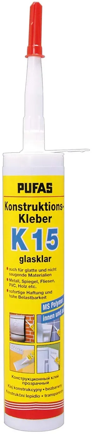Zustand: Neu - 40,00 € / kg - Universalkleber - PUFAS UNKWN - K15 93 - EAN: 4007954350010 - MS-Polymer lösungsmittelfrei sofortige Haftung und hohe Belastbarkeit innen und außen witterungs- und UV-beständig - Verkäufer: Farben Kontor Versand mit DHL im amazon.de Marketplace ![]() ![]() PUFAS Konstruktions-Kleber K15 klebt Metall, Spiegel, Fliesen PVC, Holz etc. 0,300 KG