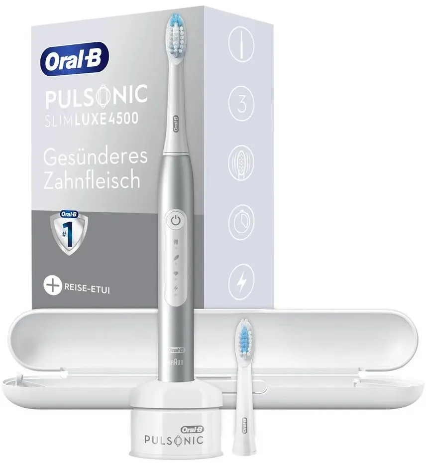 Kategorie: Elektrische Zahnbürsten - Oral-B - GTIN:4210201305675 - Technische Daten WEEE-Reg.-Nr. DE , 89633988, Farbe & Material Farbe , Silber, Hinweise Lieferumfang , Oral-B Pulsonic Slim Luxe 4500 Schallzahnbürste, Standardlieferumfang des Herstellers, Bedienungsanleitung, Informationen zur Datennutzung (nach EU Data Act) , Nein, - 79,90 Euro bei OTTO - gefunden von billiger.de Dieses Angebot ist empfehlenswert, da es die Platinum-Version in einer gängigen Größe zu einem mittleren Preis anbietet. ![]() ![]() Oral-B Elektrische Schallzahnbürste "Pulsonic Slim Luxe 4500" in Platinum | Gr.: onesize