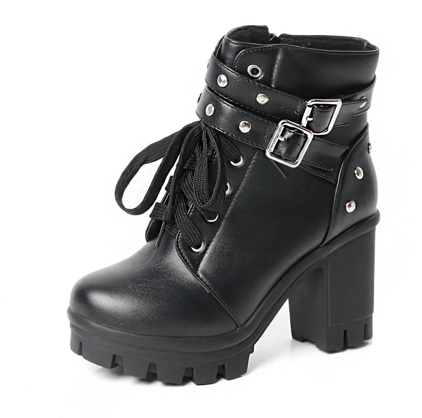 Gewöhnlich versandfertig in 4 bis 5 TagenLIPIJIXI DaHerren Plateau Heel Goth Kn?chel Stiefel Rivet Punk Stiefel Black Schnüren Stiefeletten Metal Decoration Kn?chel Stiefel with Side Zipper Chunky Heel - 39 EU