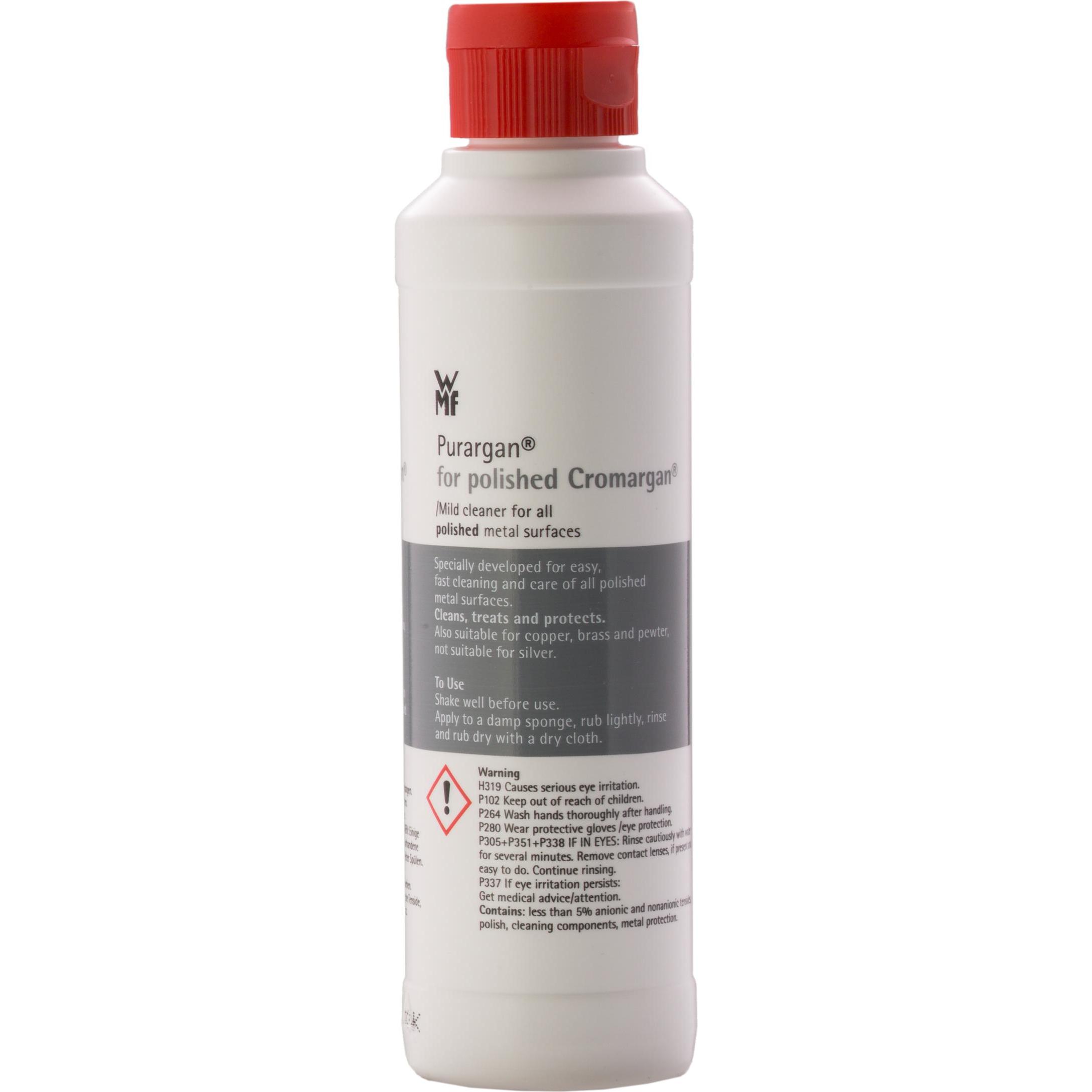59.96 € / 1 Liter - Kategorie: Reinigungsmittel - WMF - GTIN:4000530211040 - WMF Purargan CROMARGAN - Pflegemittel 250 ml Flasche Die schonende Pflege für alle hochwertigen Metall-Oberflächen - 14,99 Euro bei 1a-neuware.de - gefunden von billiger.de ![]() WMF Purargan , Pflegemittel für poliertes Cromargan