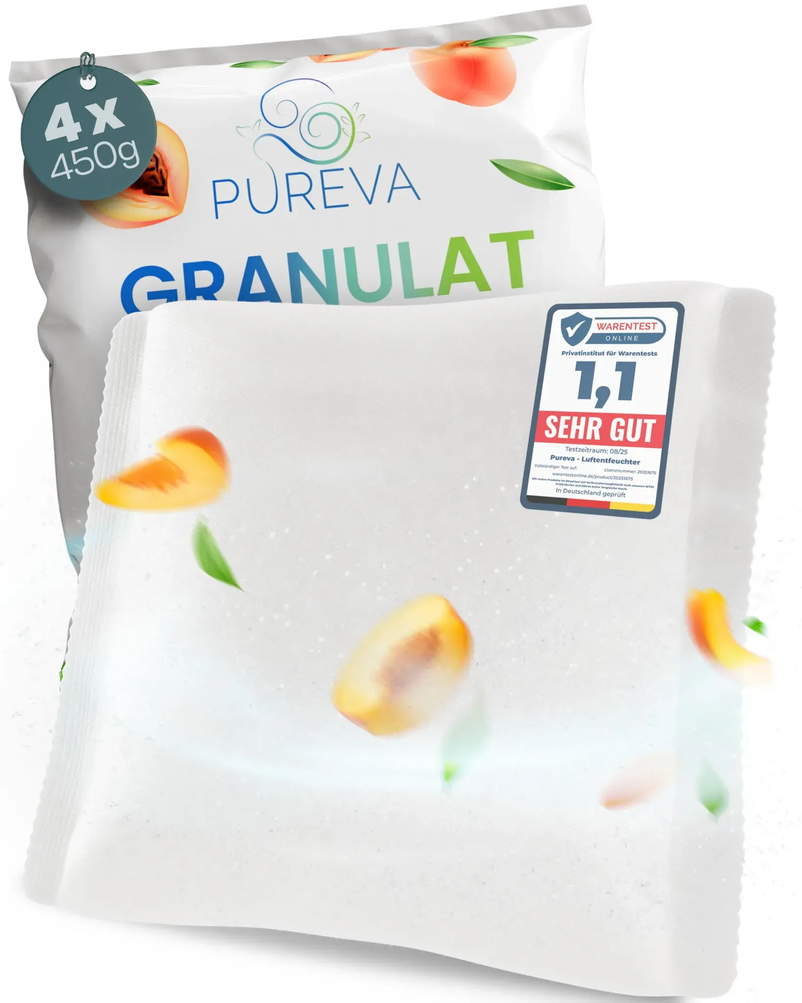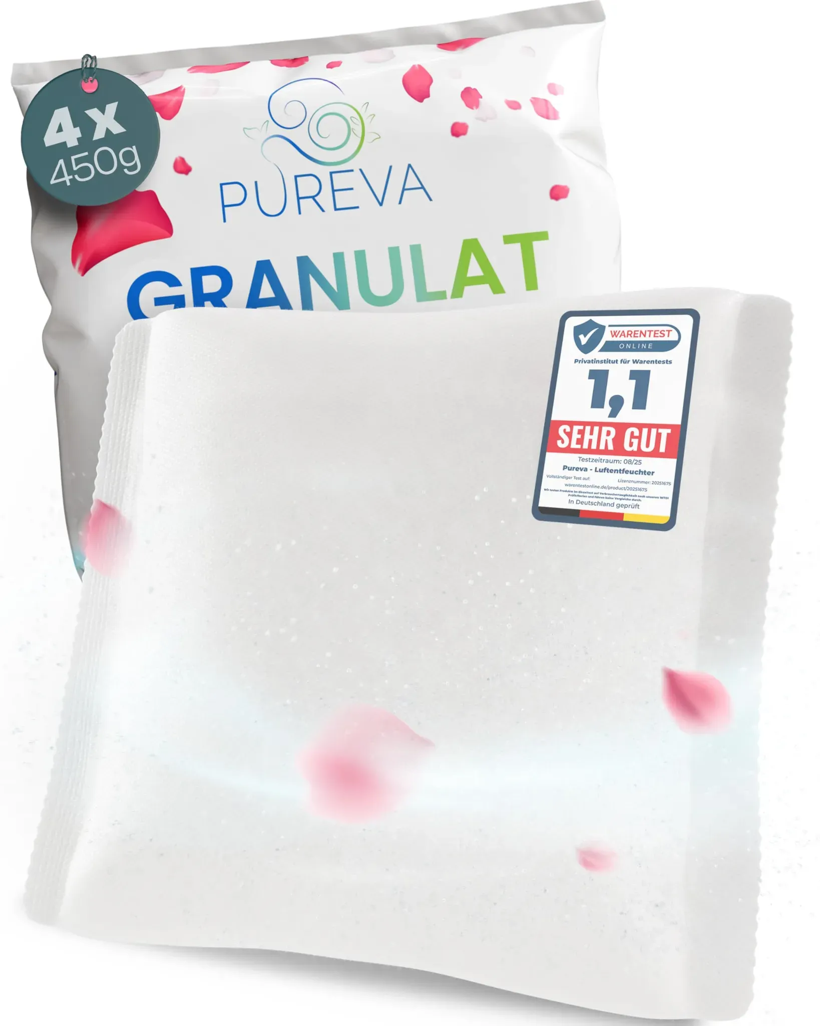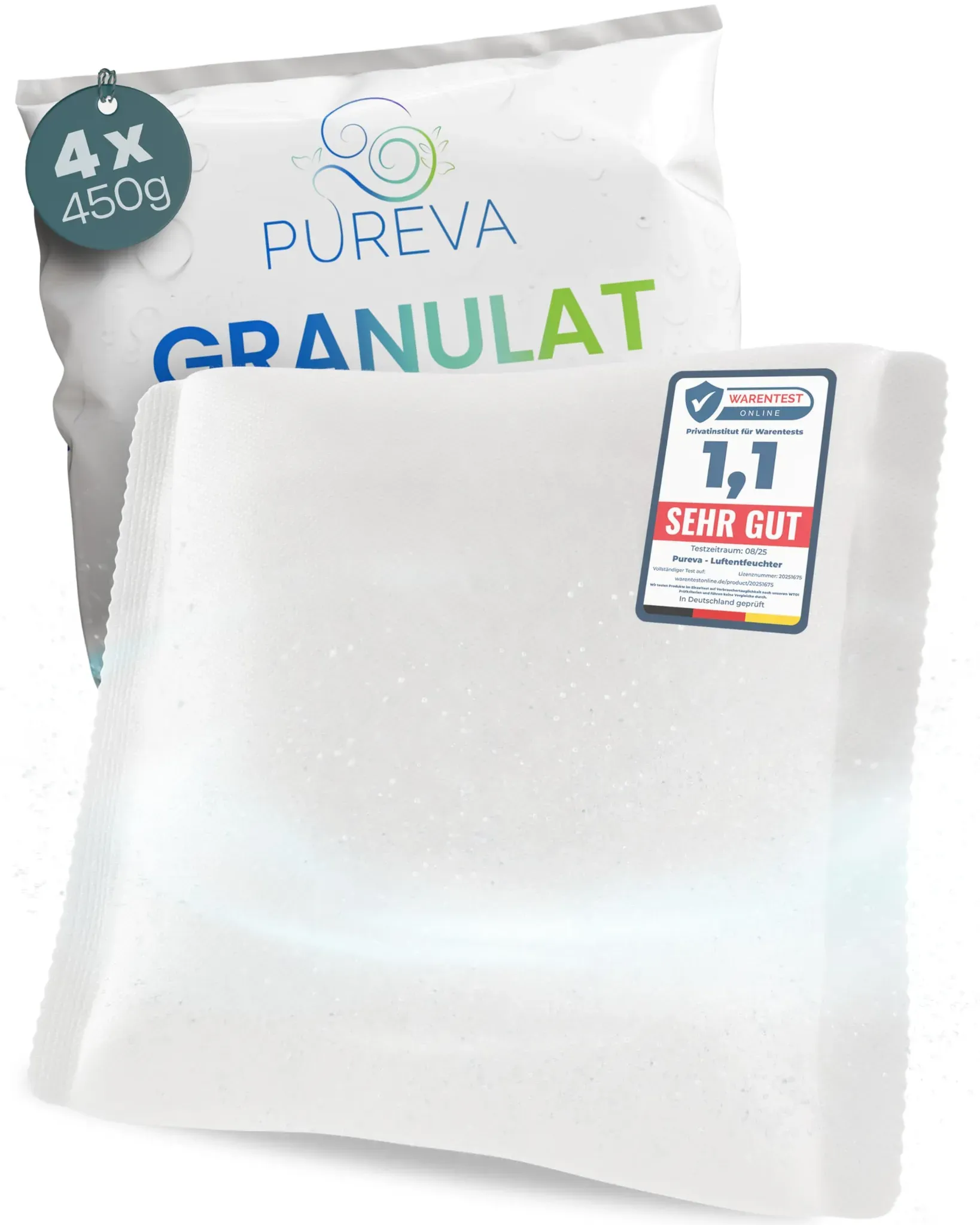 Auf Lager Versand durch AmazonPUREVA Luftentfeuchter Nachfüllpack 4x 450g [NEUESTE FORMEL] Entfeuchter Nachfüllpack mit hochwirksamem Luftentfeuchter Granulat - Entfeuchter Granulat neutralisiert Gerüche & beugt Schimmel vor