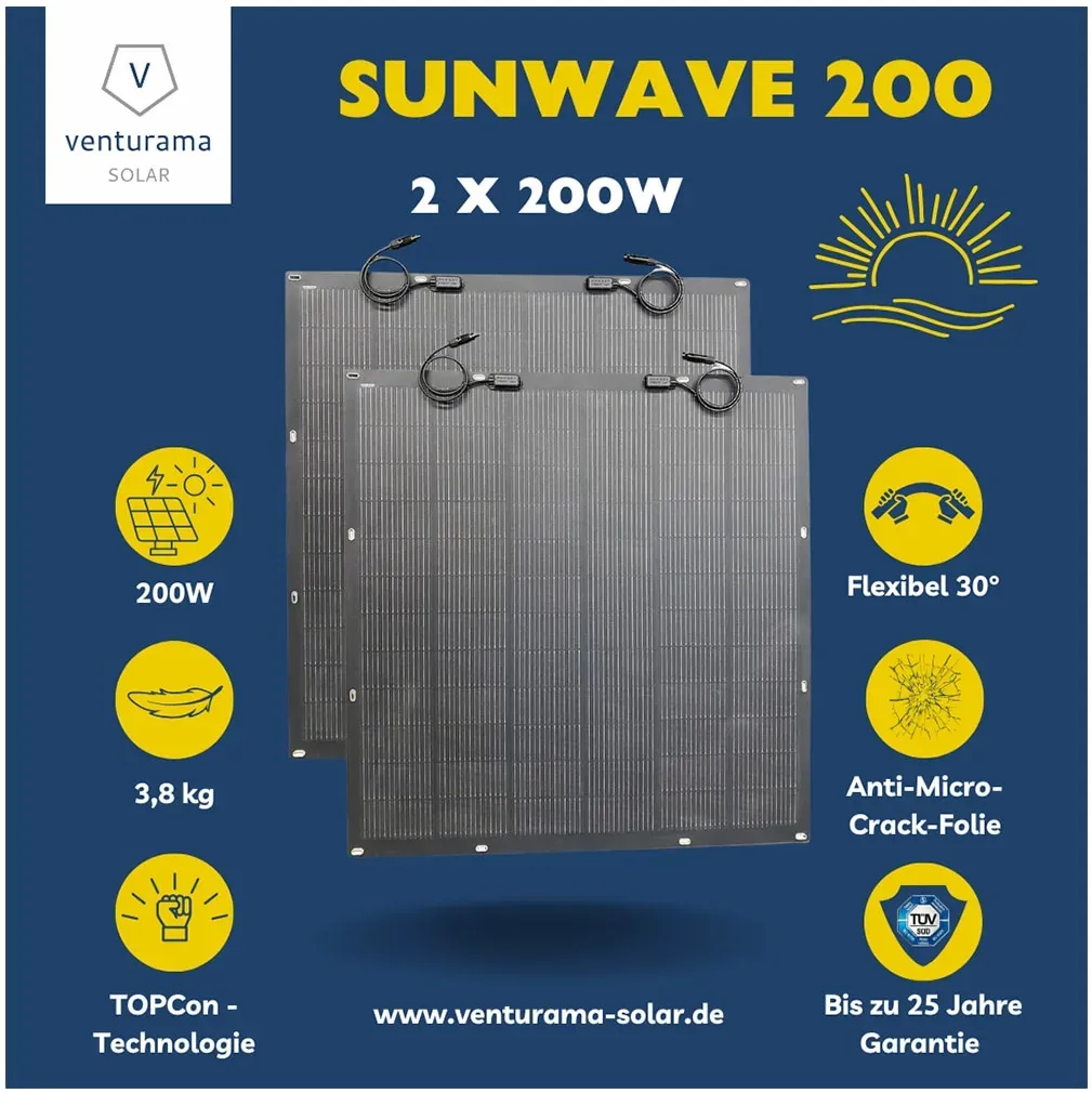 Kategorie: Solarpanele - sunniva - GTIN:4255656236419 - SUNNIVA 460W Bifacial Black Frame Glas Glas Solar Module Sunniva premium hochwertige Solar-Panelen mit 460 W bieten eine hervorragende Lösung für nachhaltige Energiegewinnung sowohl im privaten als auch im professionellen Bereich. Ideal für Haushalte, - 169,00 Euro bei netto-online.de - gefunden von billiger.de Dieses flexible PV-Modul von venturama SunWave ist eine innovative Lösung für unkonventionelle Montageorte. ![]() ![]() venturama solar venturama SunWave - Flexible PV Module