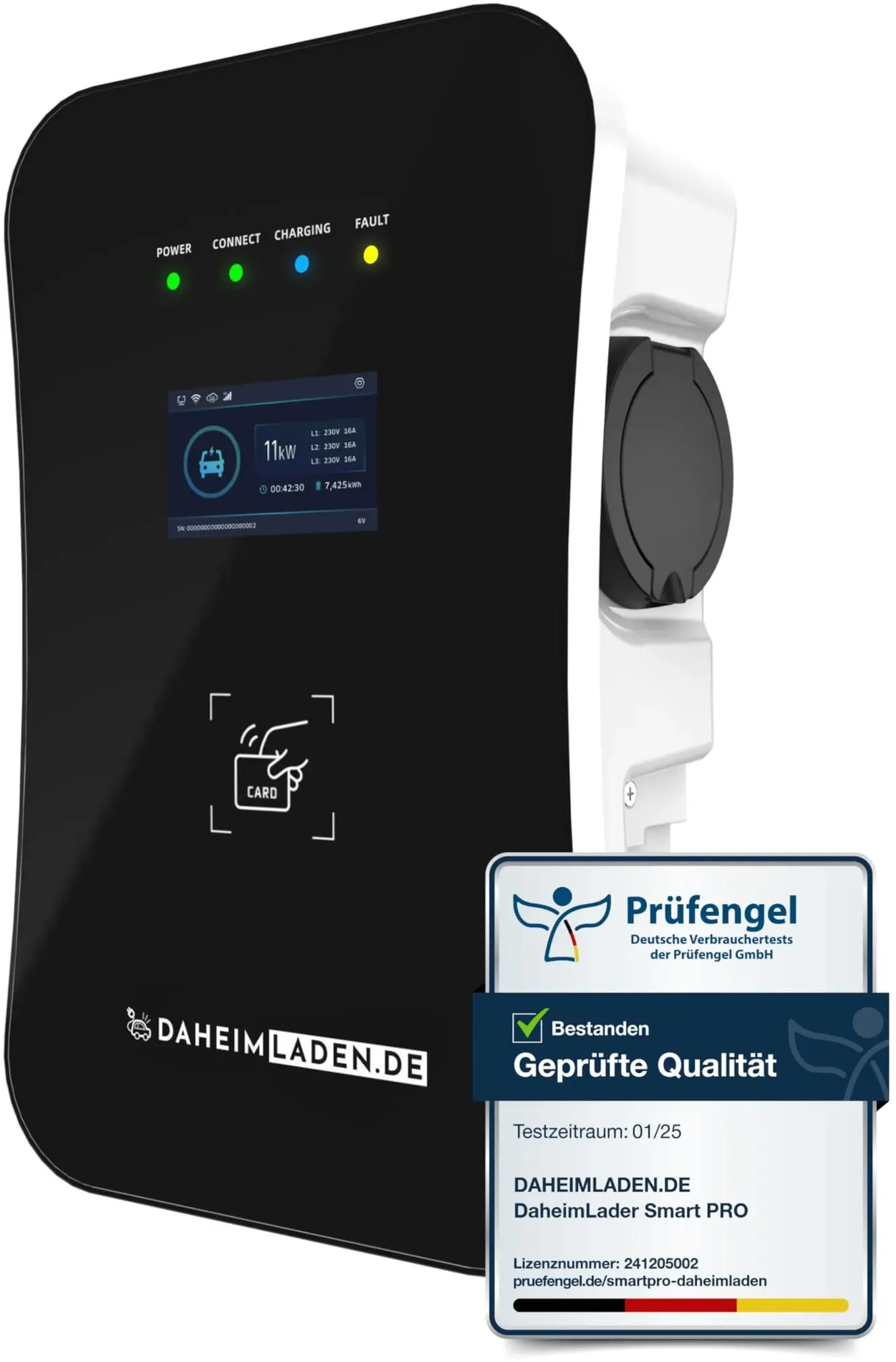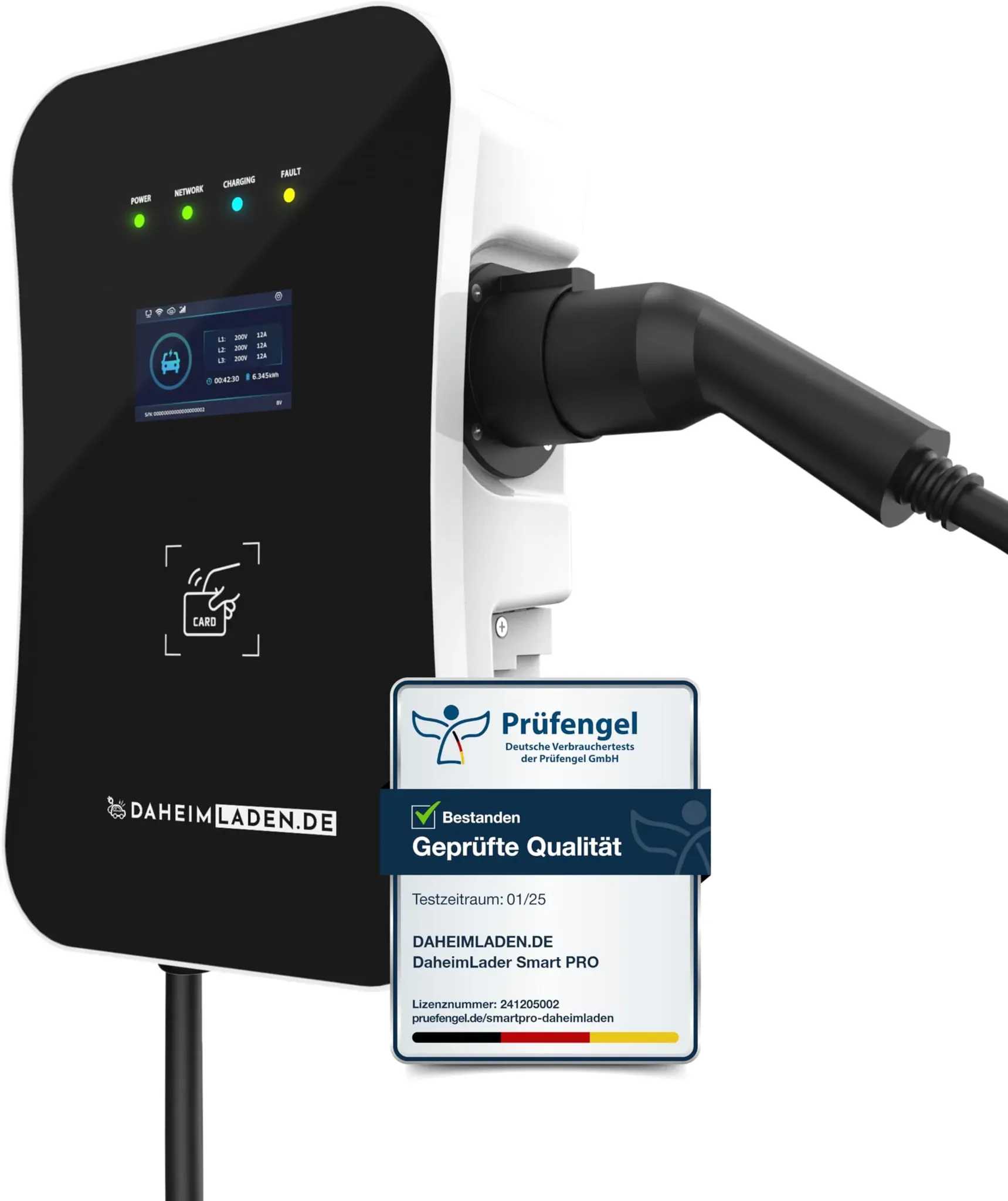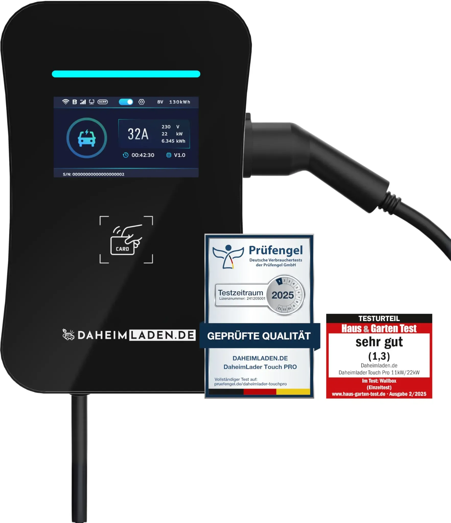 Kategorie: Wallboxen und Ladestationen - Elli - GTIN:4067989002537 - Produktdetails Einsatzbereich , Elektroauto E-Auto, Ausstattung , integrierte Kabelaufhängung RFID Kartenleser App-Steuerung PV-Laden Dynamische Phasenumschaltung, Funktionen , 22kW, Art Bedienung , App-Bedienung, Funkstandard , WLAN, App-Name , Elli Charging App, Zugangsschutz , RFID-Karte, Displayanzeige , LED Display, Eigenschaften , wetterfest spritzwassergeschützt, Art Montage , Wandmontage, Geeignet für , Privathaushalte, Art Ladestation , stationär, Technische Daten Ladeleistung maximal , 22 kW, Lademodus gemäß IEC 61851-1 , Mode 2, Typ Ladestecker , Typ 2, Phasen , 3-phasig, Schutzart , IK10 IP55, Umgebungstemperatur minimal , -25 C, Umgebungstemperatur maximal , 40 C, WEEE-Reg.-Nr. DE , 85074895, Stromversorgung Art Stromversorgung , Netzanschluss, Stromstärke , 32 A, Spannung , 220-240 V 380-415 V V, Anschlusskabel , Lieferung ohne Anschlusskabel Elektriker zum Abschluss erforderlich!, Maßangaben Kabellänge Ladekabel , 7,5 m, Hinweise Lieferumfang , Charger, Typ 2 Kabel, 1x RFID Karte, Handbuch, Sprachen Bedienungs-/Aufbauanleitung , Deutsch (DE) Englisch (EN), Artikelhinweis , Bitte beachte, dass die Wallbox ein Hochspannungsgerät ist. Das Equipment darf nur von einem qualifizierten Elektriker installiert, deinstalliert, gewartet oder repariert werden. Eine fehlerhafte oder unsachgemäße Installation, Reparatur oder Modifikation der Wallbox (etwa durch unsachgemäße Lagerung, Verwendung von ... Die DAHEIM LADEN.DE Touch PRO Wallbox bietet zusätzlich einen MID-Stromzähler und ein 5m Ladekabel für präzise Abrechnung und Komfort. ![]() ![]() DAHEIM LADEN.DE Touch PRO Wallbox 22kW mit 5m Ladekabel, mit App, MID-Stromzähler, PV-überschussladen, Lastmanagement, RFID, 14a