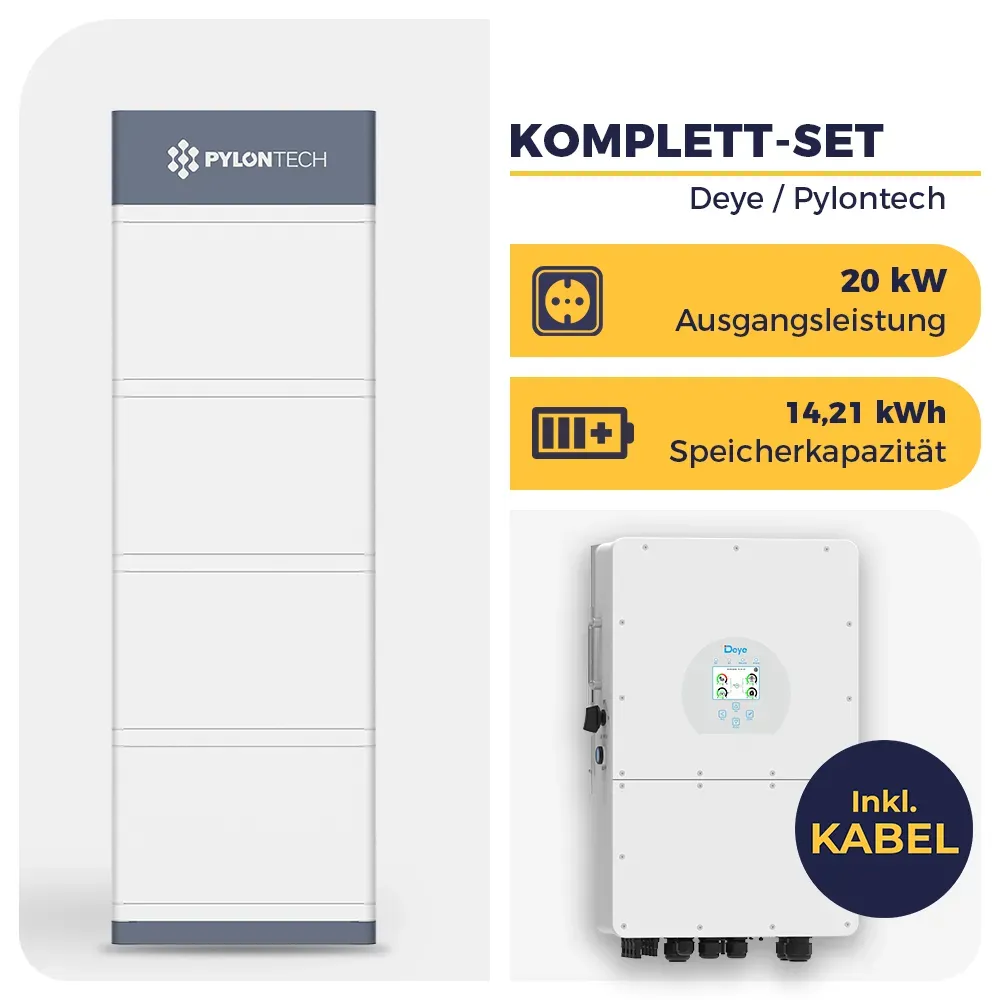 Kategorie: Wechselrichter - husatech - Pylontech Force-H2 Batteriespeicher mit Deye Hybrid-WechselrichterPylontech Force-H2 3,55 kWh Hochvolt Batterie und Deye Hybrid-Wechselrichter SetDieses Set kombiniert vier Pylontech Force-H2 3,55 kWh Hochvolt Batteriemodule mit der passenden Steuerungseinheit sowie einem leistungsstarken Deye Hybrid-Wechselrichter und dem Anschlusskabelsatz für eine effiziente und flexible Photovoltaik-Speicherlösung.Auf einen BlickHochvolt Lithium-Eisenphosphat Speicher4x Pylontech Force-H2 3,55 kWh Module für flexible KapazitätIntelligente SteuerungseinheitPylontech Force-H2 HV BMS für sicheren und störungsfreien BetriebLeistungsstarker Hybrid-WechselrichterDeye SUN-20K-SG01HP3-EU-AM2 mit 20 kW und 2 MPPT für effiziente EnergieumwandlungKomplettes AnschlusszubehörAnschlusskabelsatz für SOFAR SOLAR Hybridwechselrichter an Pylontech Lithium AkkuWie funktioniert das Batteriespeichersystem mit Hochvolt-Technologie?Das Set beinhaltet vier Pylontech Force-H2 3,55 kWh 96V Hochvolt Batteriemodule, die mit der bewährten Lithium-Eisenphosphat-Technologie eine lange Lebensdauer und hohe Sicherheit bieten. Diese Module sind flexibel erweiterbar und ermöglichen durch ihre hohe Zyklenfestigkeit eine zuverlässige Speicherung von Solarenergie.Die Pylontech Force-H2 Steuerungseinheit HV BMS überwacht und schützt die Batteriemodule vor Tiefenentladung, überladung und anderen schädlichen Zuständen, um einen störungsfreien Betrieb sicherzustellen.Welche Vorteile ... ![]() ![]() Pylontech Force - H2 14,21 eBay kWh Batteriepaket Energiespeicher Hochvoltspeicher 384V
