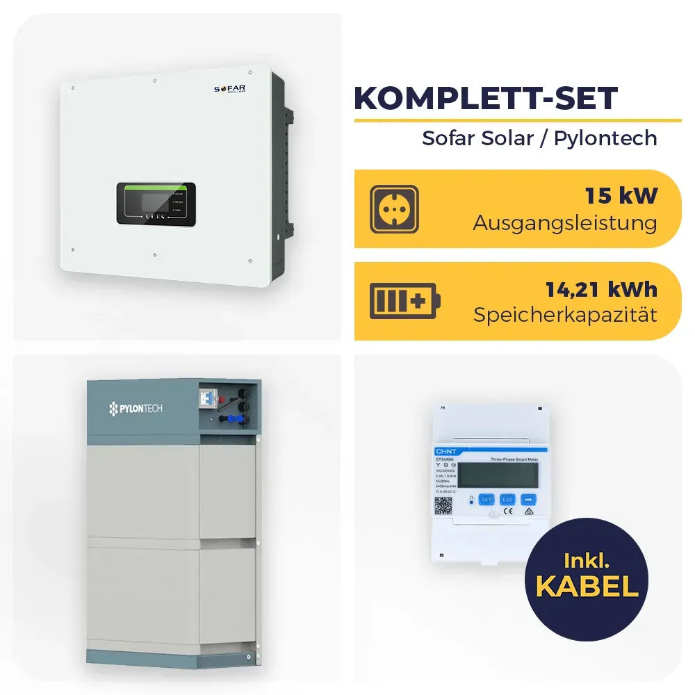 Kategorie: Wechselrichter - SOFAR - GTIN:0745202895589 - Pylontech Force-H2 Hochvolt Batteriespeicher Set mit SOFAR SOLAR Hybrid-WechselrichterPylontech Force-H2 Steuerungseinheit HV BMS & SOFAR SOLAR HYD 15KTL-3PH SetDieses Set kombiniert leistungsstarke Pylontech Force-H2 Hochvolt Batteriemodule mit der Steuerungseinheit HV BMS und dem effizienten SOFAR SOLAR HYD 15KTL-3PH Hybrid-Wechselrichter inklusive Smart Meter. So erhältst Du ein flexibles, erweiterbares und sicheres Energiespeichersystem für Deine Photovoltaikanlage, das Deinen Eigenverbrauch optimiert und eine zuverlässige Stromversorgung sicherstellt.Auf einen BlickHohe Leistung und FlexibilitätModular erweiterbare Hochvolt-Batterien mit 14,2 kWh GesamtkapazitätSicherer BetriebSteuerungseinheit HV BMS schützt vor überladung, Tiefentladung und KurzschlussIntelligentes EnergiemanagementHybrid-Wechselrichter mit Smart Meter maximiert Eigenverbrauch und steuert EinspeisungEinfache IntegrationAnschlusskabelsatz für nahtlose Verbindung zwischen Wechselrichter und BatterieWie funktioniert das Hochvolt-Batteriespeichersystem?Das Set enthält vier Pylontech Force-H2 3,55 kWh 96V Hochvolt Batterie LiFePO4 Module, die zusammen eine Kapazität von bis zu 14,2 kWh bieten. Diese Batterien nutzen die bewährte Lithium-Eisenphosphat-Technologie, die für hohe Sicherheit, lange Lebensdauer und hohe Zyklenfestigkeit steht. Durch das modulare Design kannst Du die Speicherkapazität flexibel an Deinen Bedarf anpassen.Die Pylontech ... ![]() ![]() husatech Deye Hybrid-Wechselrichter SUN-15K-SG01GP3-EU-AM2 mit Pylontech Force H2 | Hochvolt-Speichersystem | 3-phasig | 15 kW | 14,21 kWh