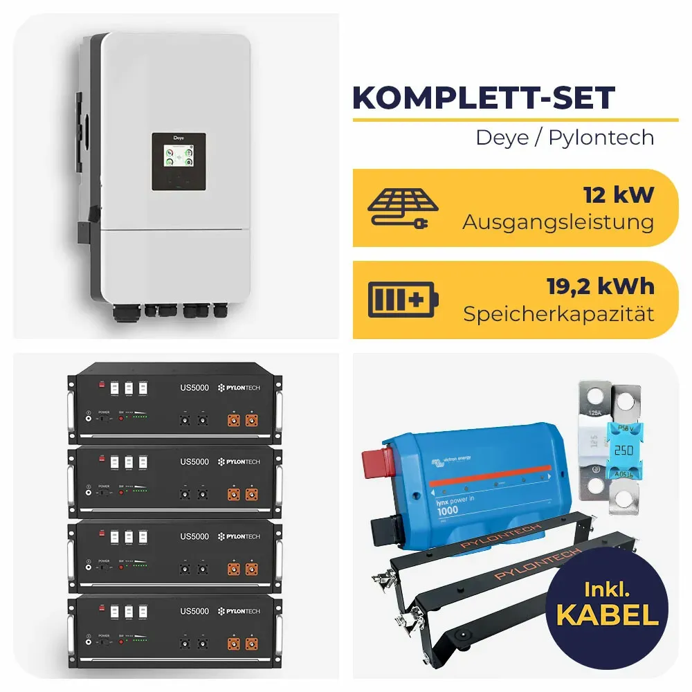 Kategorie: Stromspeicher - PYLONTECH - GTIN:4262397633223 - In diesem Bundle erhältst Du zusätzlich zum Pylontech US5000 1-C LiFePO4-Akku die passenden Brackets, die für eine bessere Luftzirkulation und ein sicheres vertikales Stapeln der Batterien nützlich sind. Außerdem sind für die Verbindung aller Komponenten ein Wechselrichter-Anschlussset enthalten. Unterhalb der Beschreibung findest Du eine Liste mit kompatiblen Wechselrichtern, welche vom Hersteller in Verbindung mit dem Batteriespeicher getestet wurden. Eine Kompatibilitätsliste für Pylontech mit über 30 Marken und Unternehmen, darunter beispielsweise Victron Energy, Votronic, Growatt u. v. m., findest Du als Download in unseren Anhängen am Fuße dieser Beschreibung (Pylontech Compatibility List). Das Pylontech US5000 1-C Bundle enthält: 4x Pylontech US5000 1-C LiFePO4 4x Pylontech Halterung / Brackets für US5000 4x Pylontech Batterieanschlusskabelset Pylontech zu Wechselrichter Pylontech US5000 1-C LiFePO4 Bei der Pylontech US5000 1-C handelt es sich um einen Lithiumspeicher der neuesten Generation. Der Speicher wurde speziell entwickelt, um den hohen Ansprüchen gerecht zu werden, die heutzutage an einen Solarspeicher gestellt werden. Sogar bei regelmäßig tiefer Entladung rt der Pylontech US5000 dank neuester Technologie höchste Sicherheit und eine lange Lebensdauer. Zusätzlich bietet die neueste Batterie des marktführenden Herstellers, mit nun 4,8 kWh pro Modul, wieder einmal viel Sicherheit. Das in jedem Modul ... Dieses Angebot ist eine hervorragende Komplettlösung, die einen Deye Hybrid-Wechselrichter mit zwei Pylontech US5000 Batterien kombiniert und somit eine sofort einsatzbereite PV-Anlage darstellt. ![]() ![]() husatech Deye Hybrid-Wechselrichter SUN-12K-SG04LP3 mit 4 x Pylontech US5000 1-C | 3-phasig | 12 kW | 19,2 kWh