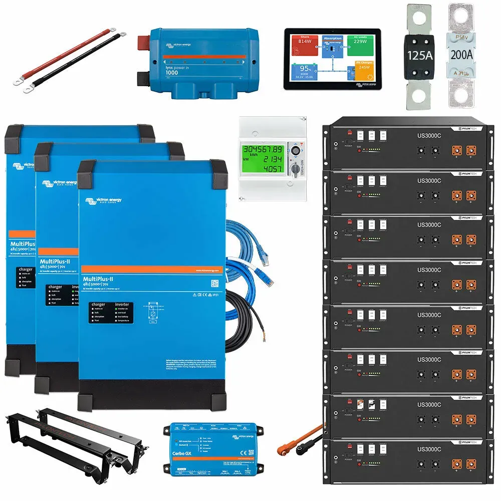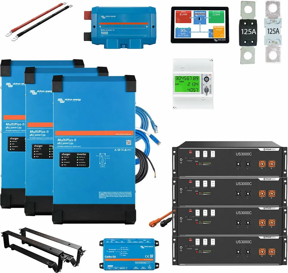 Kategorie: Stromspeicher - husatech - HUSATECH PowerSet 3 Phasig mit Victron Energy Multiplus II 48/3000/35-32 und 14,4kWh Pylontech US3000C Speicher Das Heimspeicher-Set für Haushalte (2-6 Personen) mit einem mittleren Jahresstromverbrauch von mehr als 4500 kWh Der Victron Energy MultiPlus II Wechselrichter ist das intelligente Gerät, welches eine zentrale Rolle im Stromnetz bei Dir zuhause spielt. Er wandelt den von Deiner Solaranlage erzeugten Gleichstrom in nutzbaren Wechselstrom für den Betrieb Deines Haushaltes um. Darüber hinaus kann er auch als Ladegerät für den Batteriespeicher dienen und bei Bedarf als unterbrechungsfreie Stromversorgung (USV) fungieren. So ist sichergestellt, dass Deine wichtigen Gerätschaften wie Sauerstoffgerät oder Kühlschrank auch bei einem Stromausfall weiterhin mit Energie versorgt werden! Der MultiPlus II ist so konzipiert, dass er je nach den Bedürfnissen automatisch zwischen den verschiedenen Funktionen wechseln kann, um eine zuverlässige Stromversorgung zu gewährleisten. Er lässt sich mit einem MPPT-Solar-Ladegerät oder einem Netz-Einspeise-Wechselrichter für PV-Anlagen kombinieren. Erzeugt die PV-Anlage mehr Energie als Du gerade verbrauchst, wird der überschüssige Strom in den Akku geleitet. Sobald die Sonnenverhältnisse nachlassen, wird nicht genügend Energie produziert, um den Eigenbedarf zu decken. Erst dann wird die gespeicherte Energie wieder aus dem Akku entnommen. Ein Energiemanager sorgt dafür, dass der Stromfluss optimal ... Dieses große Paket mit 7x US3000C und 24,5 kWh Solarspeicher ist eine ausgezeichnete Wahl für maximale Speicherkapazität und profitiert von der 0% MwSt. ![]() ![]() Pylontech '7 x US3000C 24,5 kWh Solars '(0% MwSt 12 III UstG)