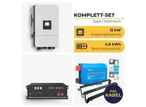 - - Niedervolt-Speicher mit 12 kW Leistung und 4,8 kWh Speicherkapazität Dieses dreiphasige Niedervolt-Speichersystem besteht aus dem Deye Hybrid-Wechselrichter SUN-12K-SG05LP3-EU-SM2 mit 12 kW Ausgangsleistung und einem Pylontech 5000 1-C Akku mit 4,8 kWh Speicherkapazität. Zusammen sind sie ein hochwertiges Batteriespeichersystem für Deine PV-Anlage. Ein regelrechtes Dream-Team also. Die maximale PV-Eingangsleistung beträgt 24 kW. Von den 4,8 kWh Speicherkapazität des Pylontech Batteriespeichers sind 4,56 kWh effektiv nutzbar. Der Hersteller verspricht über 6000 Ladezyklen. Wechselrichter und Batteriespeicher kommen mit bis zu 1 n Hersteller- . Somit bist Du mit diesem Speichersystem für Deine PV-Anlage für eine sehr lange Zeit auf der sicheren Seite. Im Lieferumfang stecken nicht nur der Wechselrichter mit WiFi-Dongle und die Pylontech Speichereinheit, sondern auch die Anschlusskabel für die Batterie sowie für die Verbindung der Batterie zum Inverter. Zudem gibt es ein Paar Pylontech Brackets dazu, mit denen Du den Akku mit dem richtigen Zwischenraum für die Luftzirkulation auf den Boden stellen kannst. Und natürlich sind auch die Komponenten für den absolut sicheren Betrieb mit dabei. Enthalten ist der Victron Lynx Distributor inklusive Sicherungen. So kann jede Leitung mit einer Sicherung versehen werden, die bei zu höhen Strömen die Verbindung augenblicklich kappt. Den kompletten Lieferumfang dieses Angebotes findest Du unten auf dieser Seite. TECHNISCHE DETAILS DEYE ... Ein preiswertes 1-phasiges PowerSet mit Victron MultiPlus-II und 9,6 kWh Pylontech US5000 Speicher, ideal für kleinere Anwendungen. ![]() 367016 / husatech.d e_Intext_B NPL HUSATECH PowerSet 1 Phasig mit Victron MultiPlus-II 48/5000/70-50 GX und 9,6 kWh Pylontech US5000 Speicher