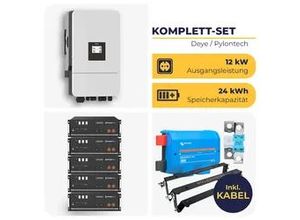 - - Niedervolt-Speicher mit 12 kW Leistung und 19,2 kWh Speicherkapazität Dieses dreiphasige Niedervolt-Speichersystem besteht aus dem Deye Hybrid-Wechselrichter SUN-12K-SG05LP3-EU-SM2 mit 12 kW Ausgangsleistung und vier Pylontech 5000 1-C Akkus, die es auf 19,2 kWh Gesamtspeicherkapazität bringen. Zusammen sind sie ein hochwertiges Batteriespeichersystem für Deine PV-Anlage. Ein regelrechtes Dream-Team also. Die maximale PV-Eingangsleistung beträgt 24 kW. Die vier Speichereinheiten des Pylontech Batteriespeichers kommen mit jeweils 4,8 kWh Speicherkapazität, von denen jeweils 4,56 kWh nutzbar sind. Der Hersteller verspricht über 6000 Ladezyklen. Wechselrichter und Batteriespeicher kommen mit bis zu 1 n Hersteller- . Somit bist Du mit diesem Speichersystem für Deine PV-Anlage für eine sehr lange Zeit auf der sicheren Seite. Im Lieferumfang stecken nicht nur der Wechselrichter mit WiFi-Dongle und vier Pylontech Speichereinheiten, sondern auch die Anschlusskabel für die Batterien sowie für die Verbindung der Batterien zum Inverter. Zudem gibt es vier Paar Pylontech Brackets dazu, mit denen Du die Akkus untereinander fest verbindest. Damit kannst Du sie sicher aufstellen und sie haben genug Zwischenraum, damit die Luft perfekt zwischen den einzelnen Speichereinheiten zirkulieren kann. Und natürlich sind auch die Komponenten für den absolut sicheren Betrieb mit dabei. Enthalten ist der Victron Lynx Distributor inklusive Sicherungen. So kann jede Leitung mit einer Sicherung ... Ein leistungsstarkes 3-phasiges System mit Deye Hybrid-Wechselrichter und 24 kWh Speicherkapazität, geeignet für Haushalte mit hohem Energieverbrauch. ![]() 367016 / husatech.d e_Intext_B NPL Deye Hybrid-Wechselrichter SUN-12K-SG05LP3 mit 5 x Pylontech US5000 1-C | 3-phasig | 12 kW | 24 kWh