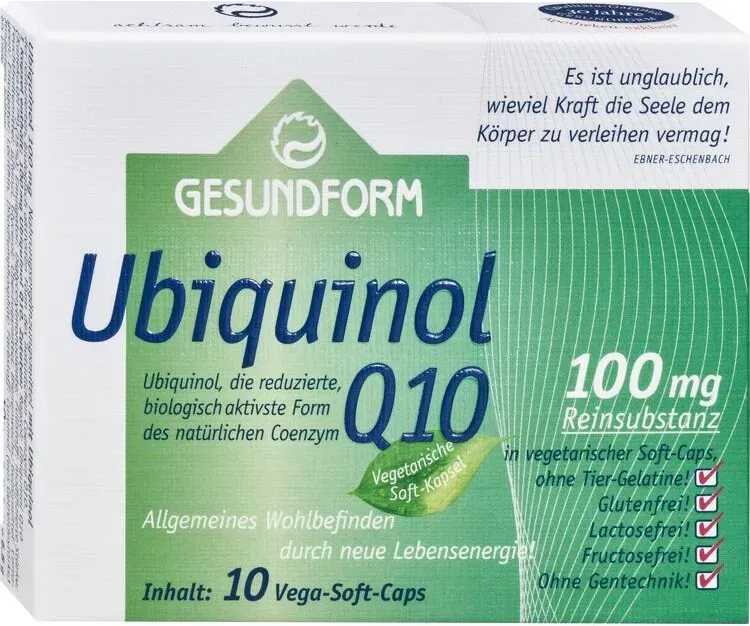 Kategorie: Nahrungsergänzungsmittel - ViVe Supplements - GTIN:8720053121232 - HERVORRAGENDES PREIS-LEISTUNGSVERHäLTNIS: 30 LiCaps Ubiquinol 50mg. Zwei Kapseln enthalten 100mg Ubiquinol (Aktive Form von Co-Enzym Q10). Hochdosiert! Verzehrempfehlung: Erwachsene täglich 2 Kapseln auf die Mahlzeiten verteilt mit viel Wasser. OHNE ZUSATZSTOFFE: Die Ubiquinol Kapseln von ViVe Supplements sind frei von Gluten, Lactose, Fructose, Hefe, Soja, Pestiziden, Fungiziden, Stabilisatoren, Magnesiumstearat und Konservierungsstoffen. Non-GMO! HACCP ZERTIFIZIERT & HöCHST BIOKOMPATIBEL: Alle unsere Rohstoffe sind auf Reinheit, Sicherheit und Qualität überprüft. Restbestände von Ethylenoxid, Pestiziden und Schwermetallen sind in unseren Produkten ausgeschlossen. FöRDERT: Ubiquinol, die aktive Form von Coenzym Q10, ist ein wichtiger Bestandteil der zellulären Energieproduktion und ist ein starkes Antioxidans. - 10,95 Euro bei Amazon Marketplace Health & Personal Care - gefunden von billiger.de Dieses Produkt bietet eine kostengünstige Option für den Einstieg in die Ubiquinol-Supplementierung. ![]() ![]() Provita Apotheken Marketing- und Handels GmbH Gesundform Ubiquinol Q10 100 mg Vega-Soft-Caps