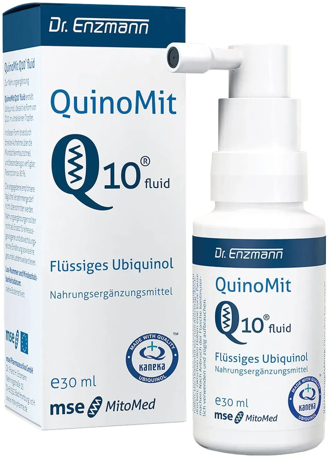 Kategorie: Nahrungsergänzungsmittel - MSE PHARMAZEUTIKA GMBH - GTIN:4260385417329 - QuinoMit Q10 fluid der perfekte Versorger: Das enthaltene Ubiquinol Q10 ist eine Schlüsselsubstanz in den Mitochondrien, den Kraftwerken der Zelle . In diesen wird die lebensnotwendige Energie für Zellen und Organe fortlaufend gewonnen. Schnell und hoch bioverfügbar: Enthält Ubiquinol, die bioaktive Form von Q10, in ultrakleinen Tropfen. Es wird etwa 8-mal besser aufgenommen als Q10-Pulverkapseln und kann unmittelbar und schneller wirken. Biologisch gewonnen und hochrein: Enthält rein biologisch gewonnenes Ubiquinol Q10 der Firma Kaneka in hochreiner Form. Frei von Milcheiweiß, Milchzucker, Gluten, Hefe, Gelatine, Aroma-, Farb- und Konservierungsstoffen. QuinoMit Q10 fluid enthält Ubiquinol, die aktive Form von Q10 in ultrakleinen Tropfen. In der aktiven Form sowie in dieser speziellen Darreichungsform liegt die Bioverfügbarkeit von Q10 etwa 8-mal höher als bei Ubiquinon Q10-Pulverkapseln (Q10 classic mse), wie Abbildung 1 zeigt. Zudem kann QuinoMit Q10 fluid direkt über die Mundschleimhaut schnell aufgenommen werden. Und Ubiquinol muss im Körper nicht mehr umgewandelt werden, sondern kann direkt wirken. Verzehrempfehlung: über den Tag verteilt 5 Hübe QuinoMit Q10 fluid auf der Zunge zergehen lassen. QuinoMit Q10 fluid kann unabhängig von den Mahlzeiten verzehrt werden. Anzahl der einheiten: 30.0 - 86,69 Euro bei Amazon Marketplace Health & Personal Care - gefunden von billiger.de Dieses Q10-Ubiquinol-Spray von KOPP Vital ist ein hochwertiges Produkt mit Original Kaneka Ubiquinol und ohne Gentechnik. ![]() ![]() KOPP Vital Q10-Ubiquinol-Spray | 50 ml | Original Kaneka Ubiquinol | ohne Gentechnik | Glutenfrei
