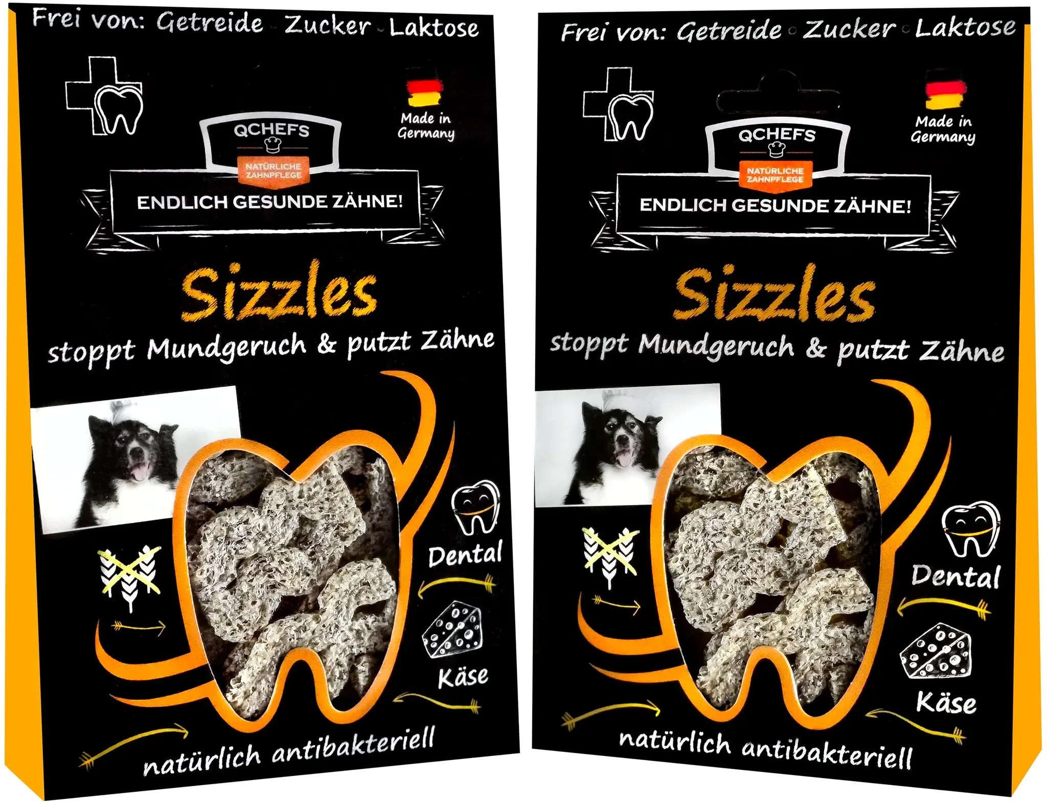 2 Händlerangebote bei billiger.de - Kategorie: Hundefutter - Qchefs - QCHEFS Sizzles -Zahnputz-Snacks für wählerische und kausensitive Hunde! Dünne Chips-Schlangen zum Knuspern und Knabbern QCHEFS Sizzels werden von allen Hunden geliebt und sind besonders für kausensitive und kleine Hunde geeignet! 1 Sizzel reicht für den Bakterienstopp aus! Bei Kontakt mit Speichel beginnen sie zu kleben, der Kaureflex wird angeregt, die Leckerlis werden weich und sind angenehm zu kauen. Mundgeruch verschwindet und die Zähne sind geputzt. Natürliche Vitamine und Mineralien fördern die Gesunderhaltung. Konsistenz: Chips zum Knuspern und Knabbern für kausensitive Hunde QCHEFS - was passiert genau? Wie wirken die Produkte? In allen QCHEFS Produkte ist reine Natur, nämlich Hüttenkäse, Rapsöl und Kokosöl, sowie je nach Geschmacksrichtung entweder Buchweizen, Reis oder Johannisbrot enthalten. Der im Hüttenkäse enthaltene Peptidkomplex ist das Geheimnis! Er lagert sich an den Zellwänden der Plaquebakterien (die Ursache für Mundgeruch, Zahnbelag und Zahnstein) an, so dass sie sich nicht mehr vermehren können. Der Mundgeruch verschwindet und Zahnstein löst sich! Mund gesund = Hund gesund! Wie unterscheiden sich die Produkte?Die unterschiedlichen QCHEFS Produkte haben verschiedenen Konsistenzen, die auf das jeweilige Kauverhalten der Hunde abgestimmt sind. Es gibt 3 verschiedene Geschmacksrichtungen, entweder mit Reis, Buchweizen oder fruchtigem Johannisbrot. Die Wirkung ist bei allen gleich. ... ![]() ![]() QCHEFS 1X Sizzles: Hunde Zahnpflege antibakteriell gegen Mundgeruch und Zähne geputzt- als getreidefreie-hypoallergene Leckerlis nach dem Hundefutter-perfekt